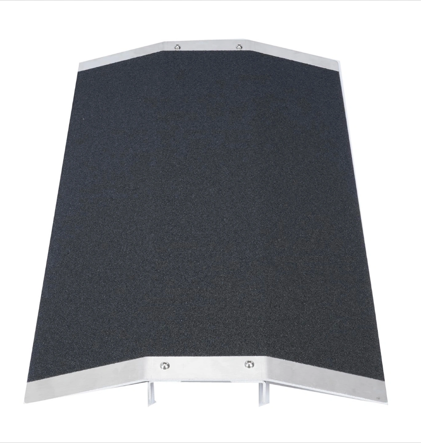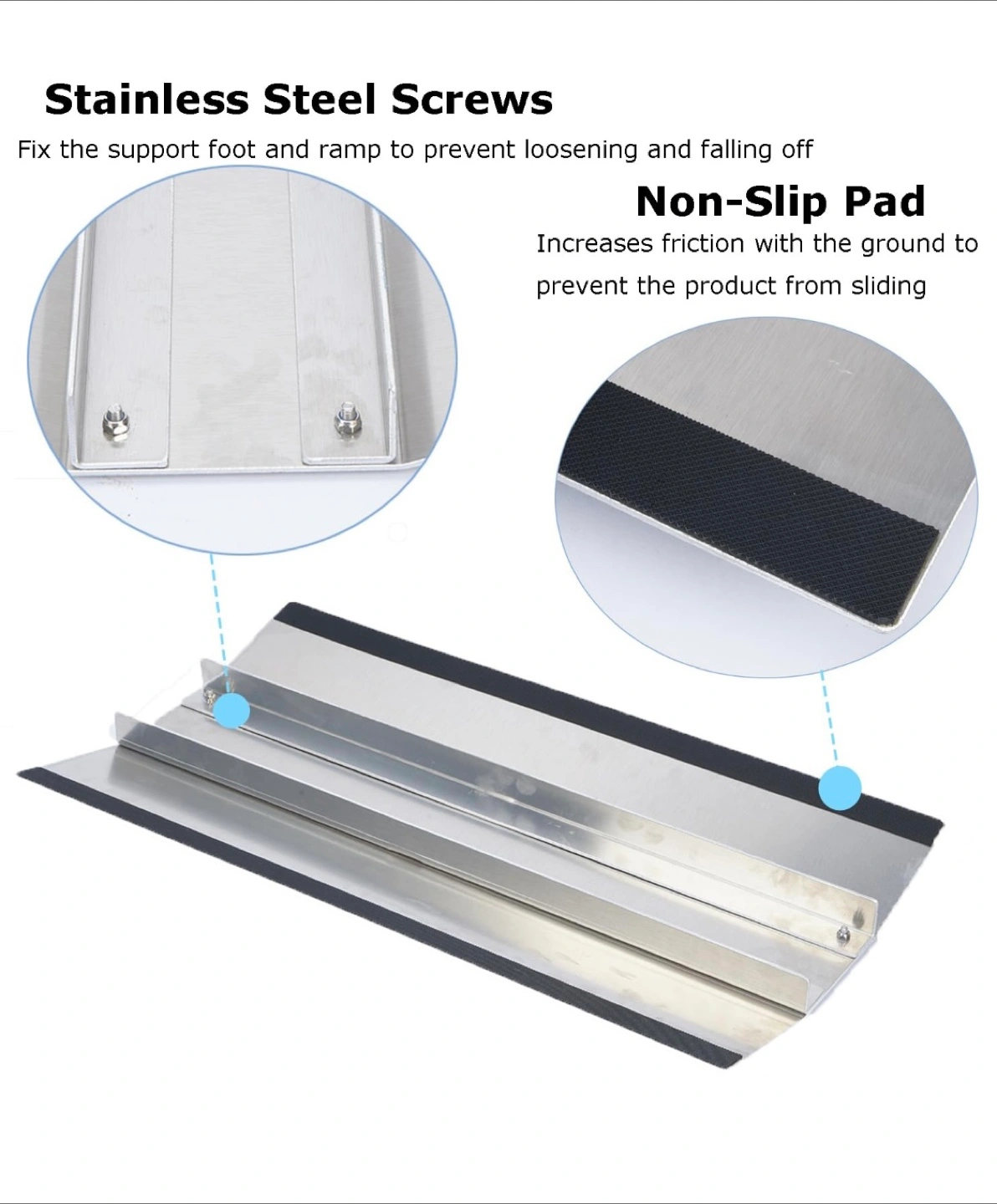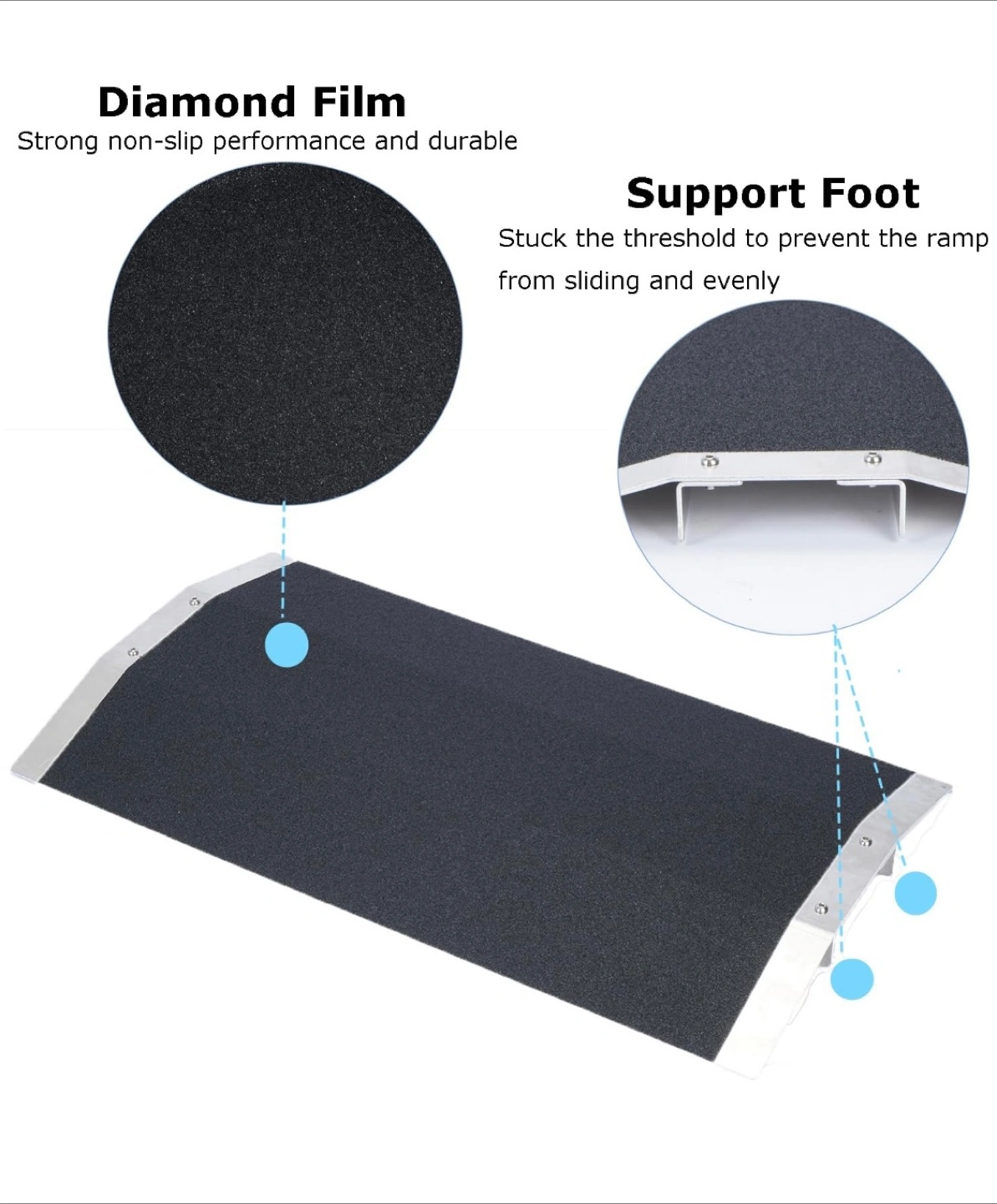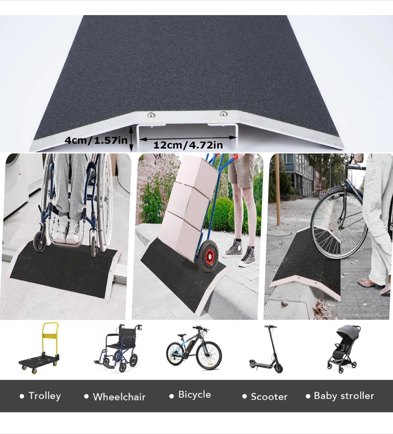 This threshold ramp is designed to help with mobility over small steps or doorways. It features a strong non-slip surface and durable diamond film. The support foot helps prevent the ramp from sliding. The stainless steel screws fix the support foot and ramp to prevent loosening. The non-slip pad increases friction with the ground to prevent the product from sliding. Dimensions are 4cm/1.57in height and 12cm/4.72in width.
