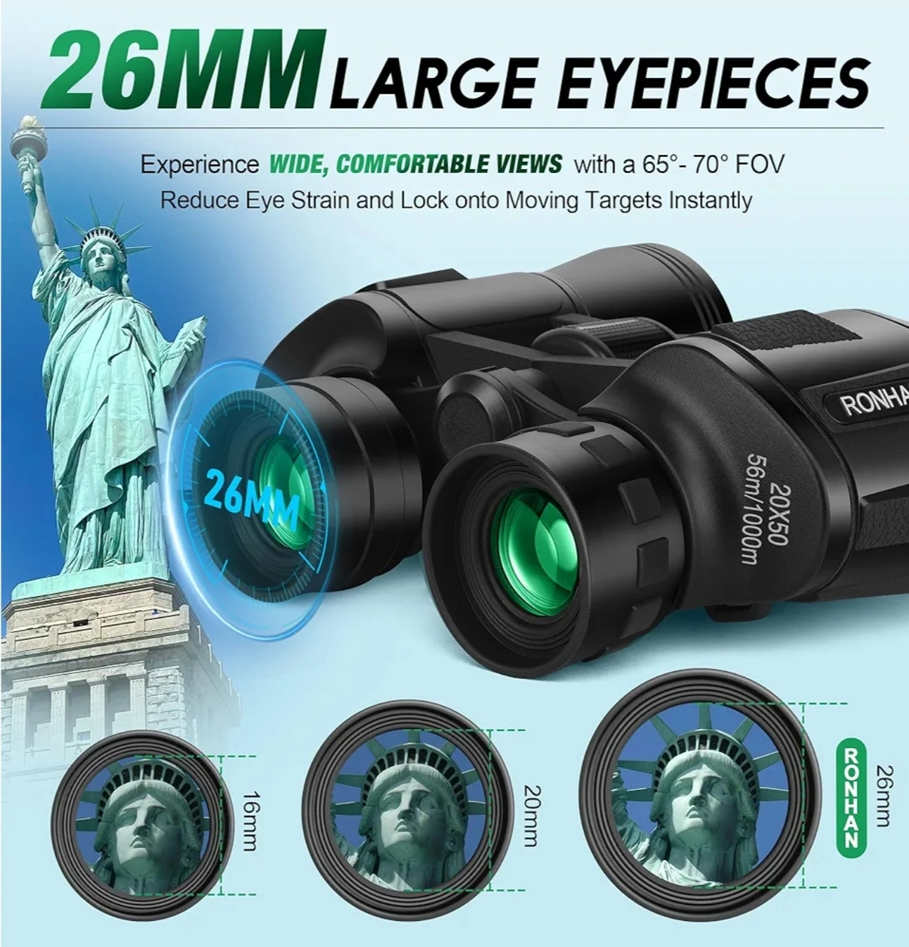 180Check out these Ronhan 20x50 binoculars! They feature: - 50mm larger objective lens for clearer details in low light - FMC coated lenses with 99.5% light transmittance - 26mm large eyepieces for wide, comfortable views - 20x magnification with a 50mm objective diameter, offering a 56m/1000m field of view - Slip-proof material and central focus wheel for easy adjustments