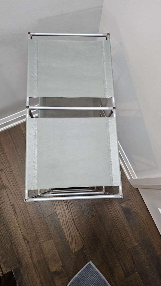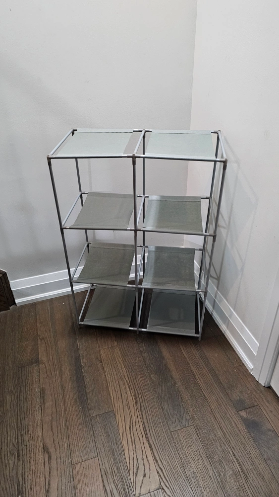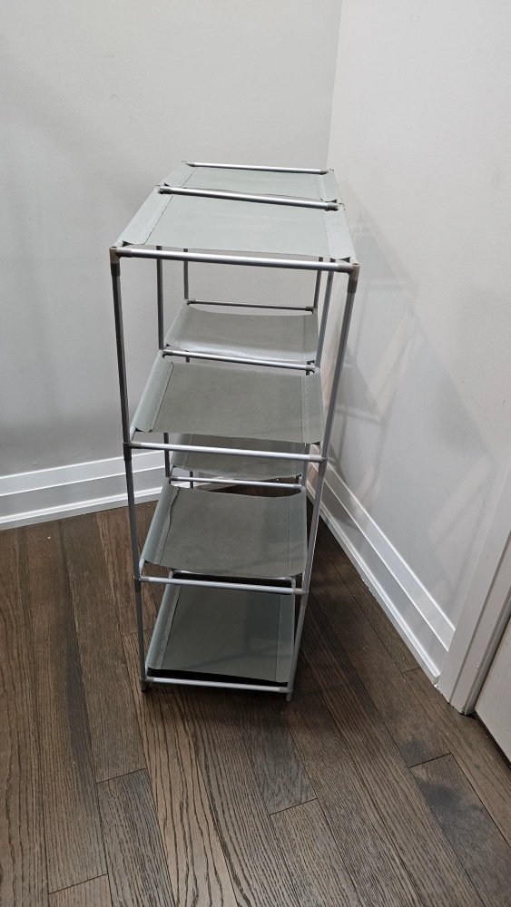 This is a 4-tier multifunctional storage rack. It's perfect for organizing your shoes, clothes, or other items. The rack is grey and in good condition. It's a great space-saving solution for any room