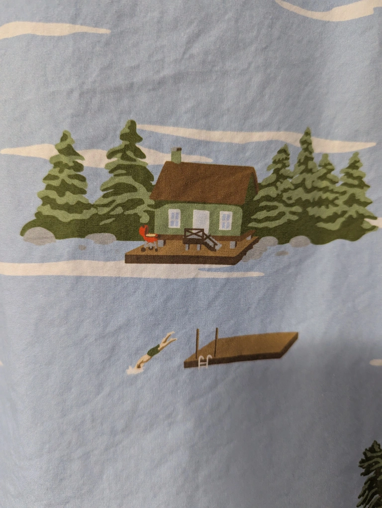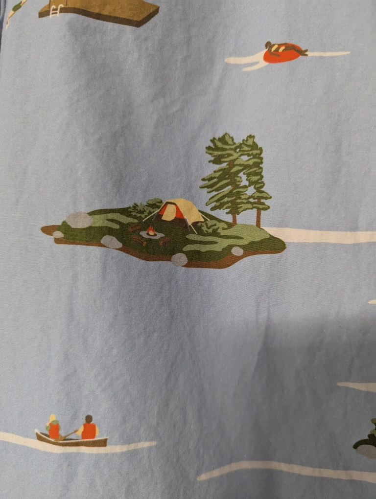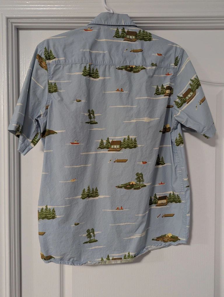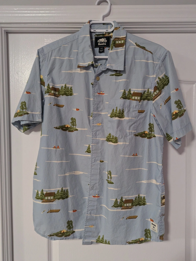 Here's a Roots men's button-up shirt featuring a fun cabin print! It's perfect for casual wear or a summer getaway. The shirt has a light blue background with various camping and cabin-themed graphics. It's in great condition and ready for a new home!