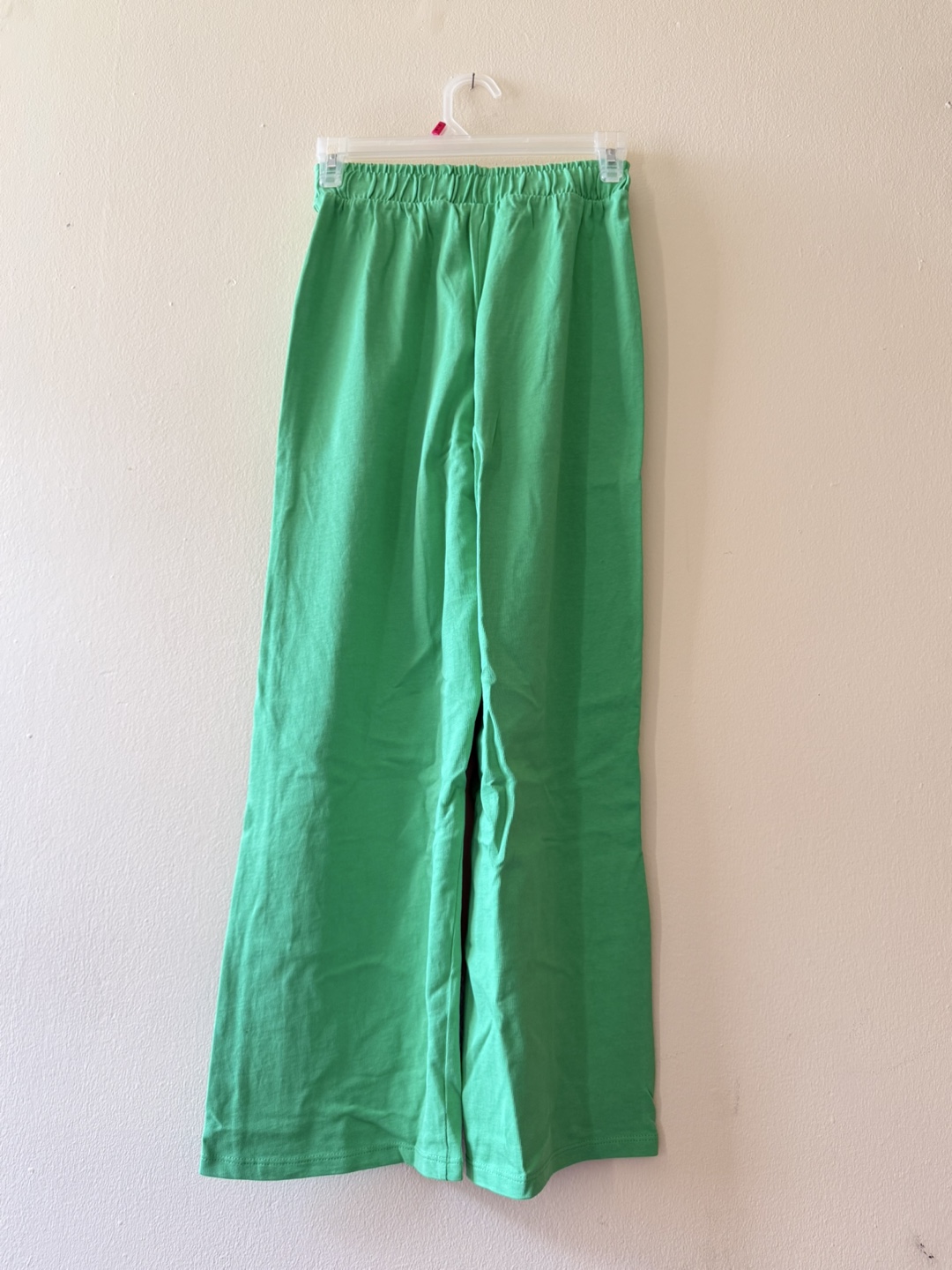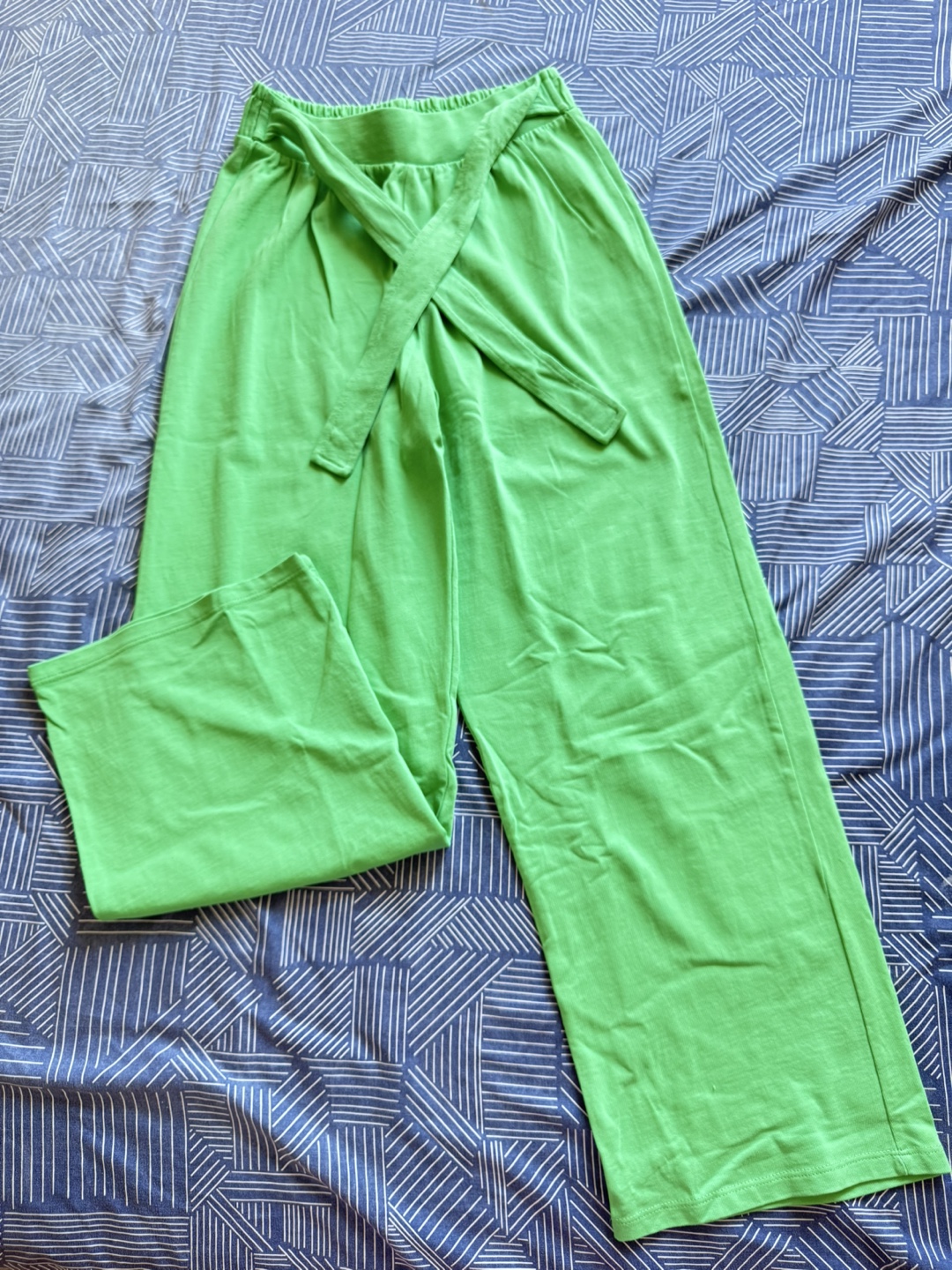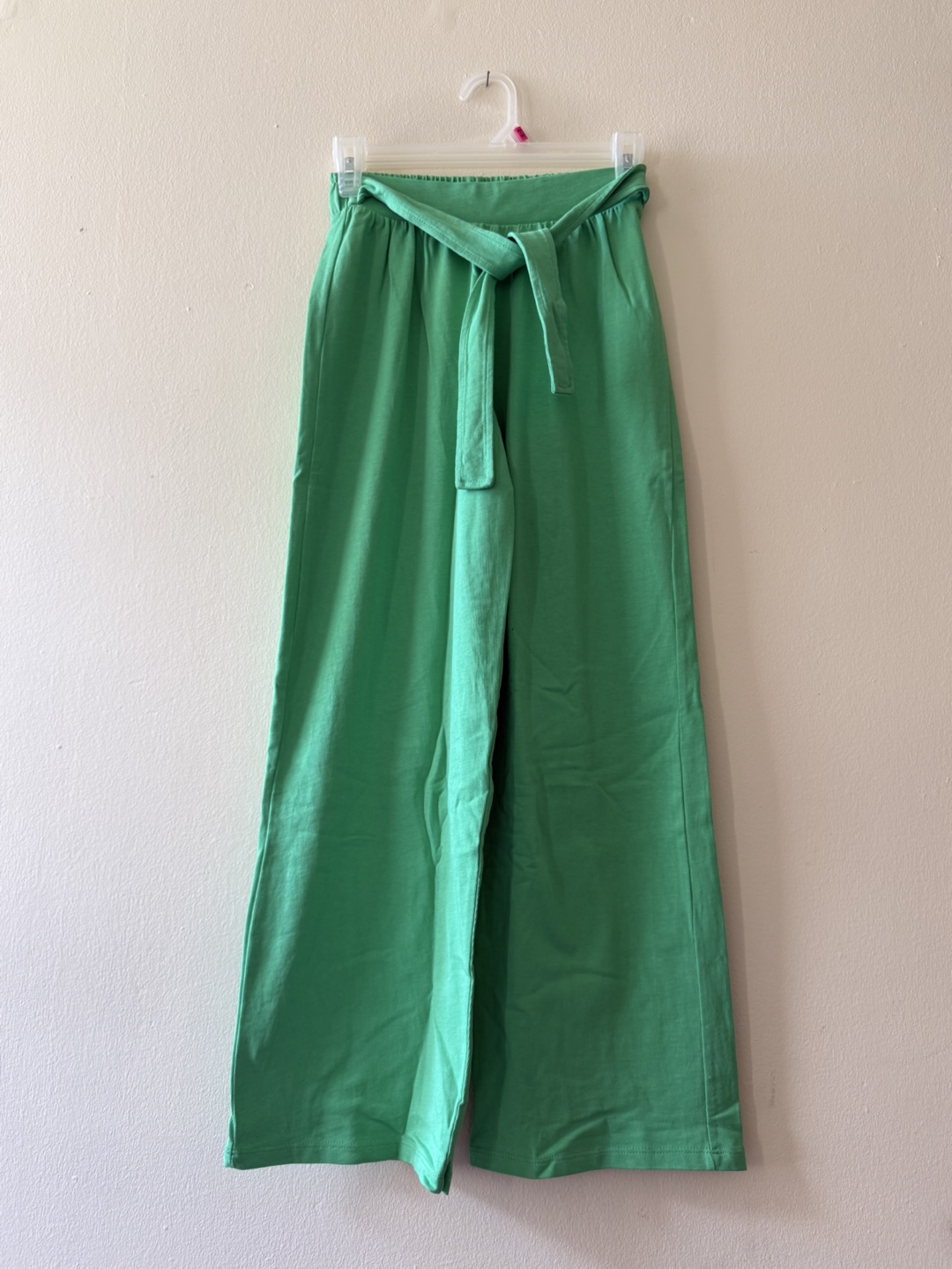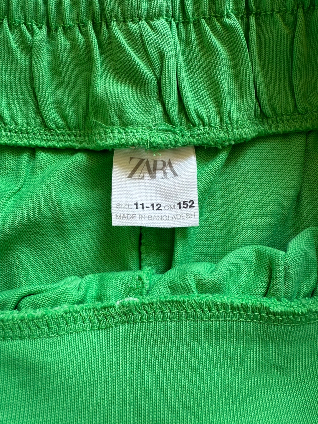 a pair of Zara kids' pants in a bright green and white colour These are a size 11-12 (CM 152) and feature a stylish belted design. They're made in Bangladesh and New