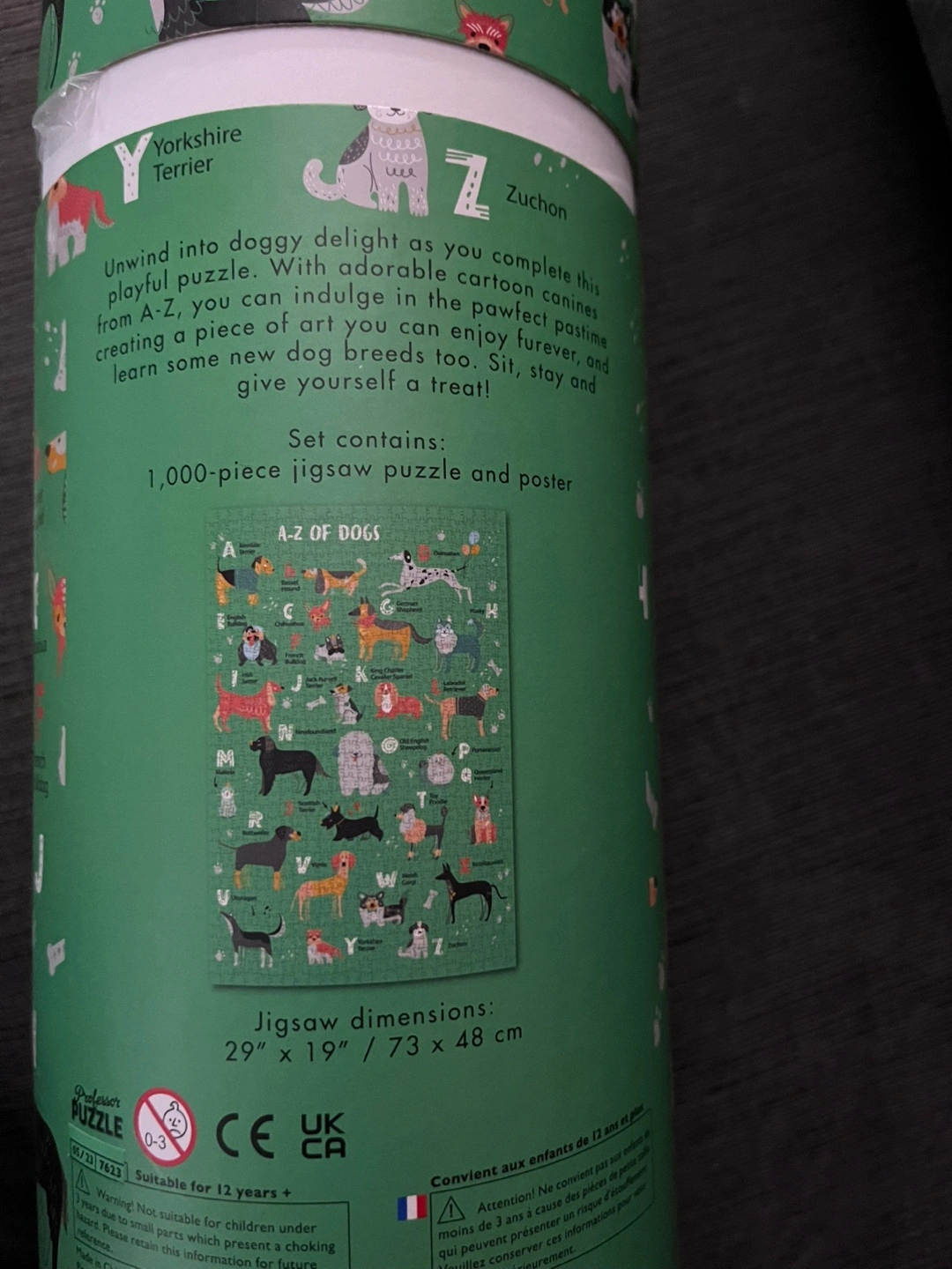 1,000-piece jigsaw puzzle from Professor Puzzle, the A-Z of Dogs! It includes a poster and the jigsaw dimensions are 29" x 19" / 73 x 48 cm. This puzzle is suitable for ages 12+