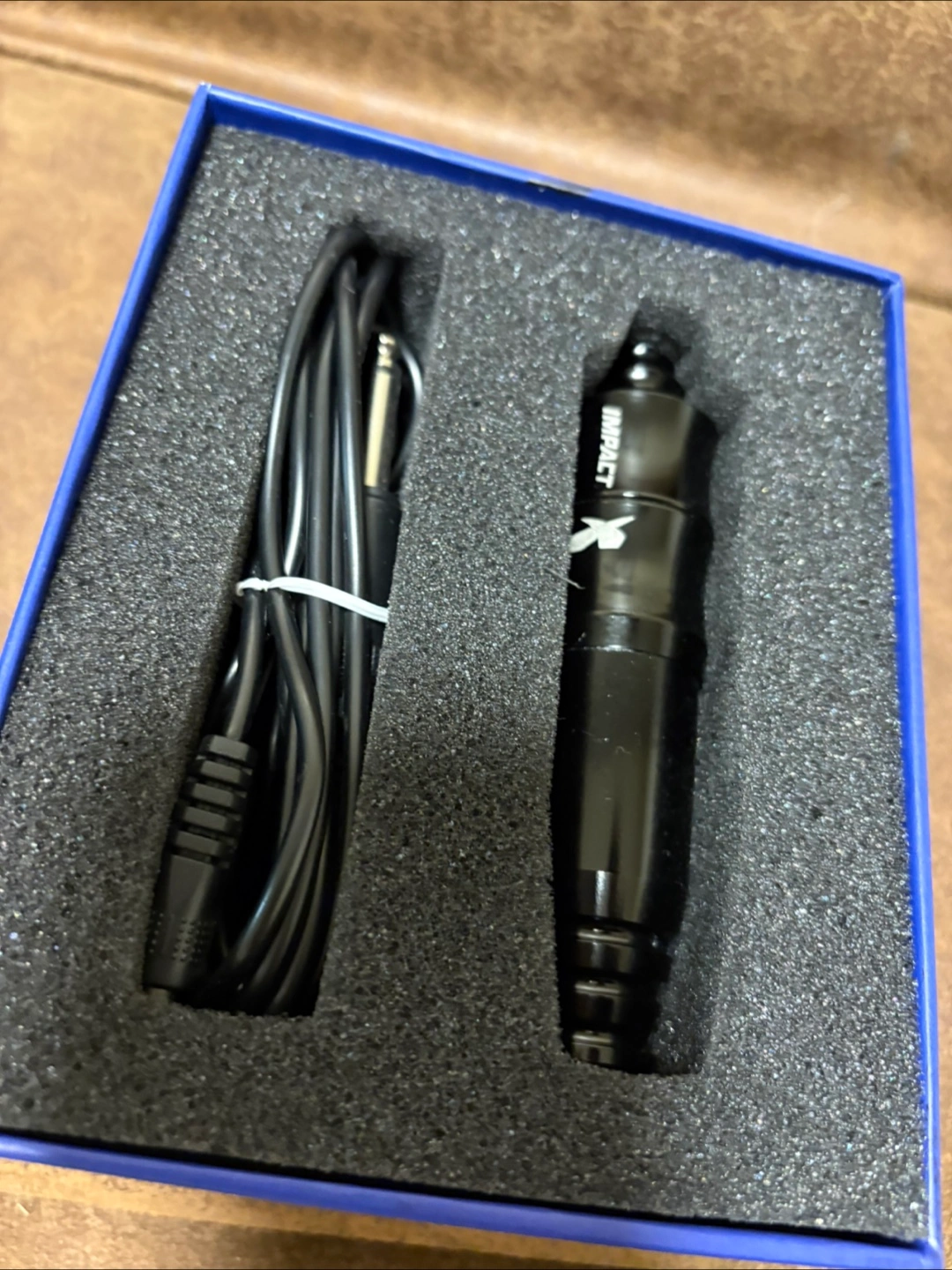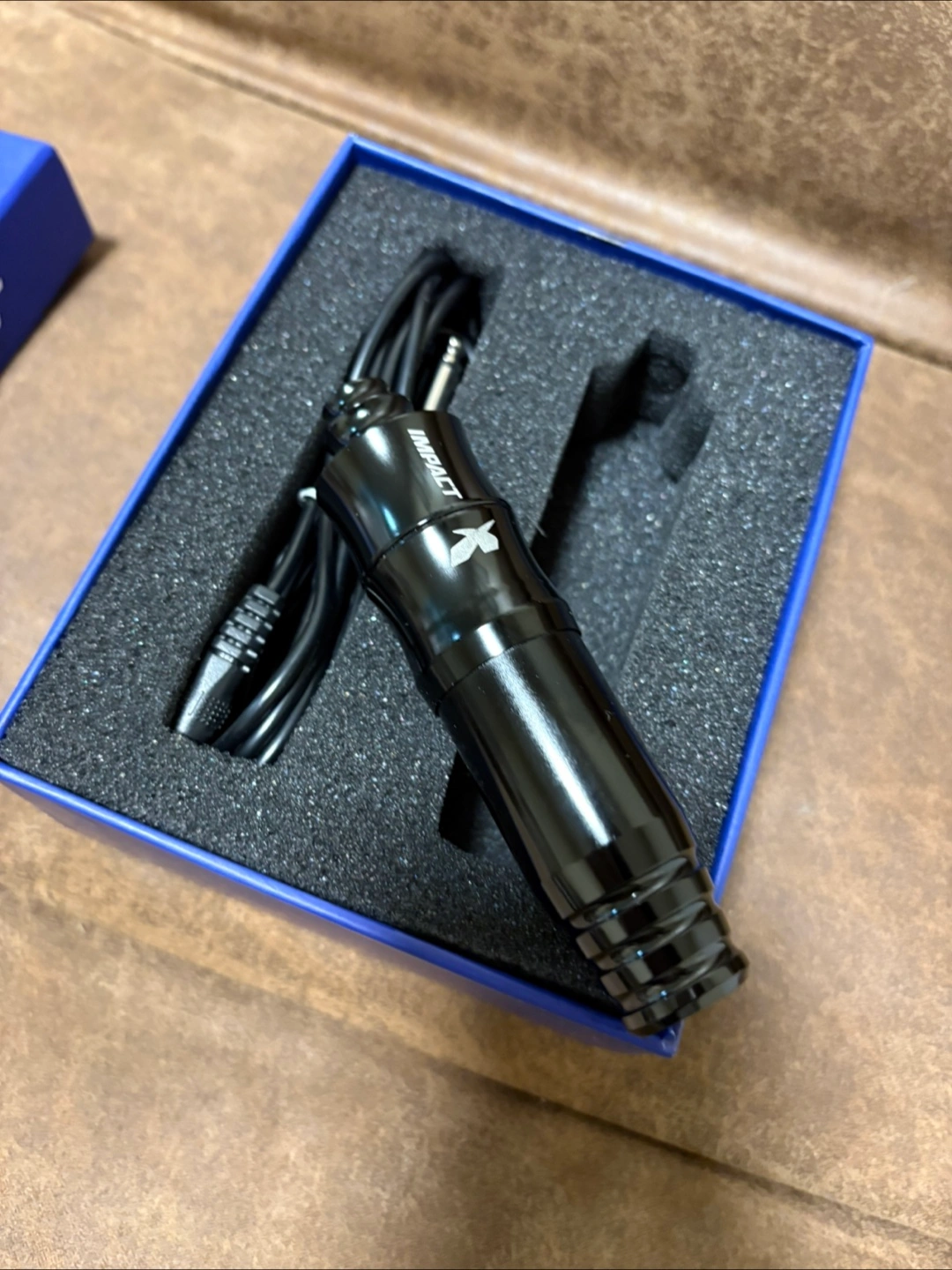 Selling an XIMPACT P-3 rotary machine pen. It comes with a mini power supply. The pen and power supply are in the original box. If you're looking for a reliable machine pen, this could be it! Everything you see in my photos goes together, it's the complete kit. Rotary machine and pedal-driven machine with power supply — tattoo.