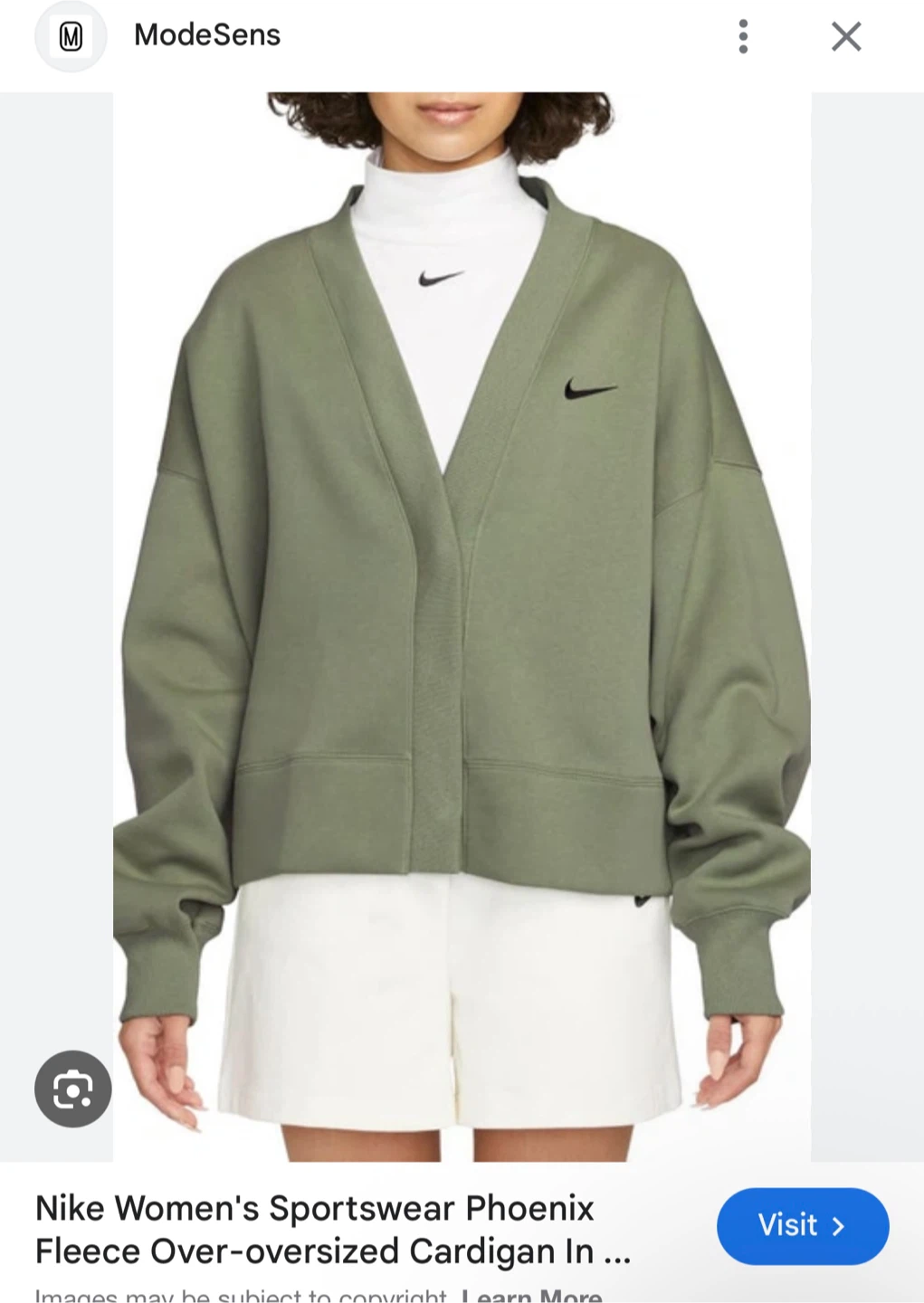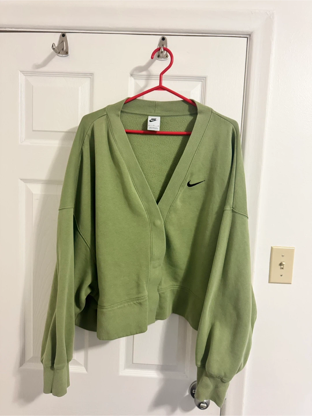 Selling a comfy Nike cardigan in size XL! It's a lovely olive green colour and in great condition. Perfect for layering or just lounging around the house. Has the Nike swoosh on the chest