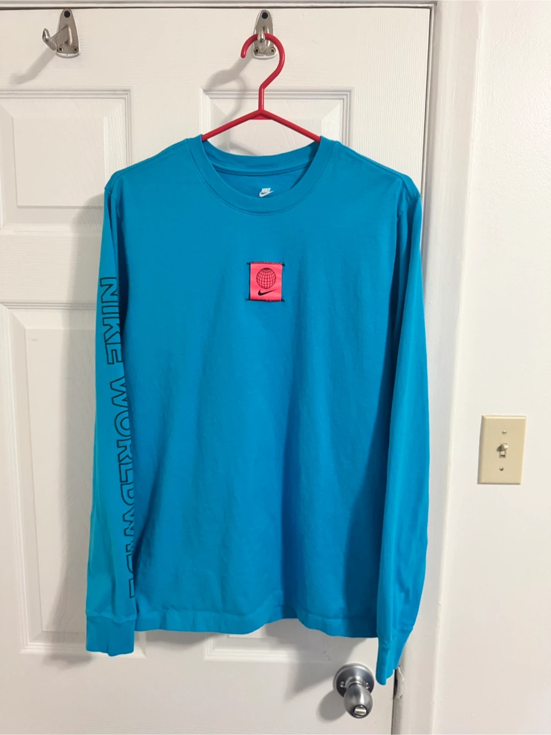 Selling a Nike Worldwide long-sleeve tee in blue. It's a size large and made of 100% cotton. The tee features a unique globe graphic on the front and back, with 'NIKE WORLDWIDE' printed down the sleeve. Great for casual wear!