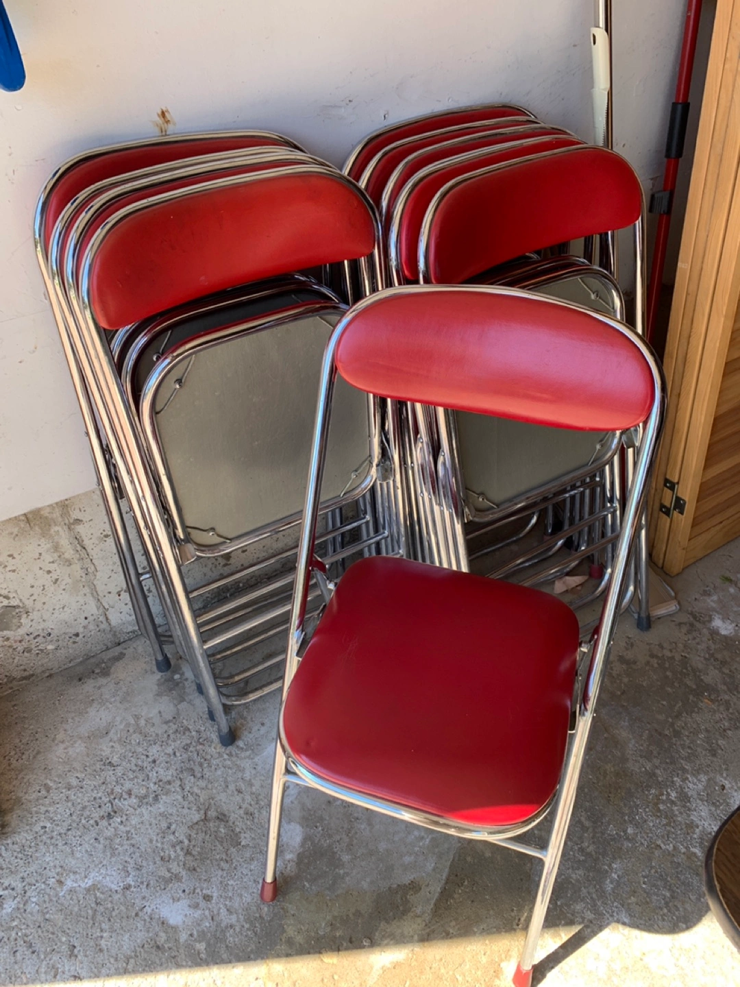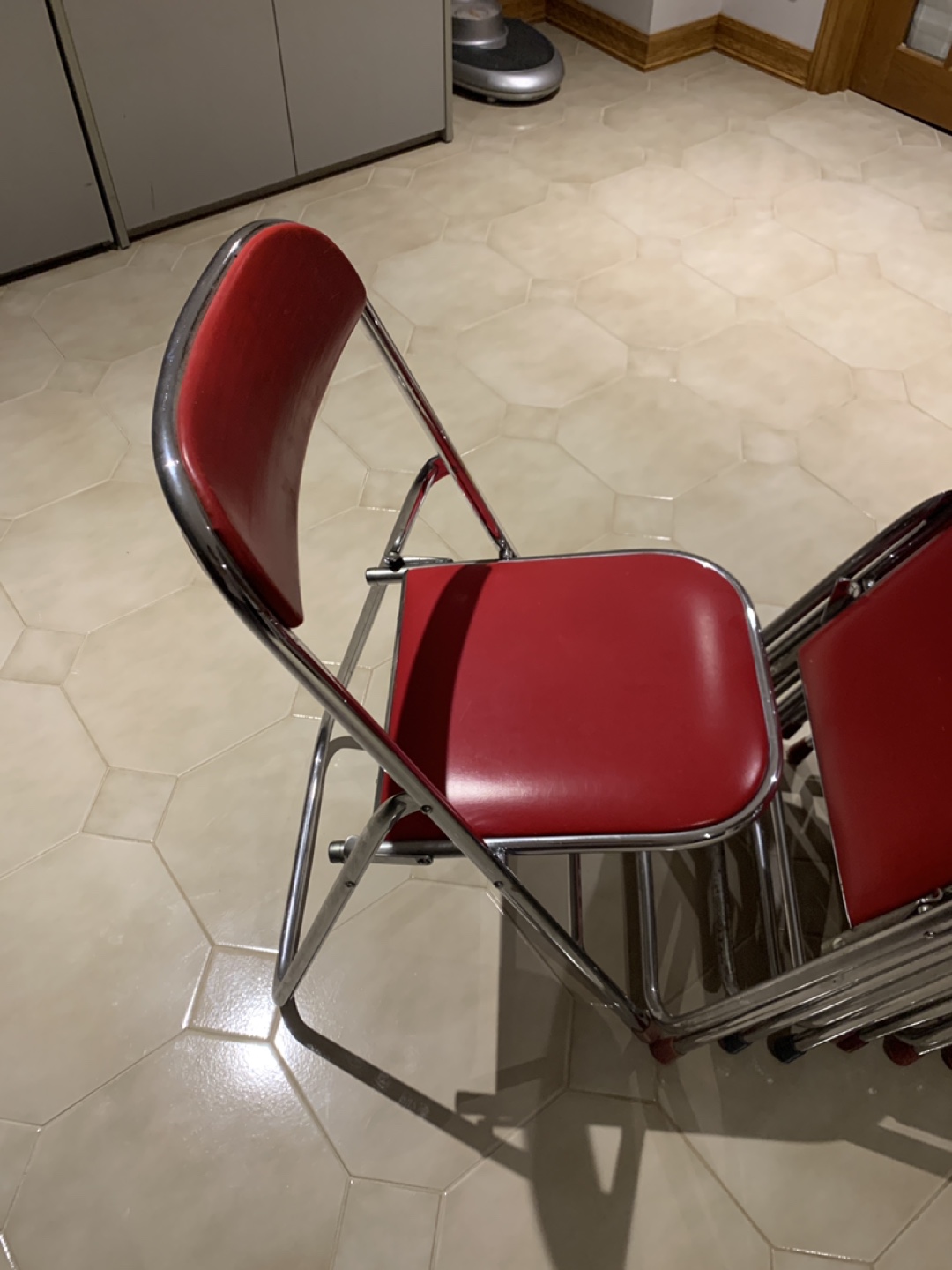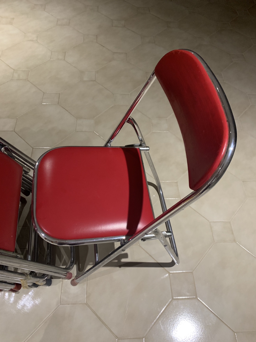 Red faux leather cover with metal structure folding chairs (total 4 for sale), perfect for extra seating and easy to store.