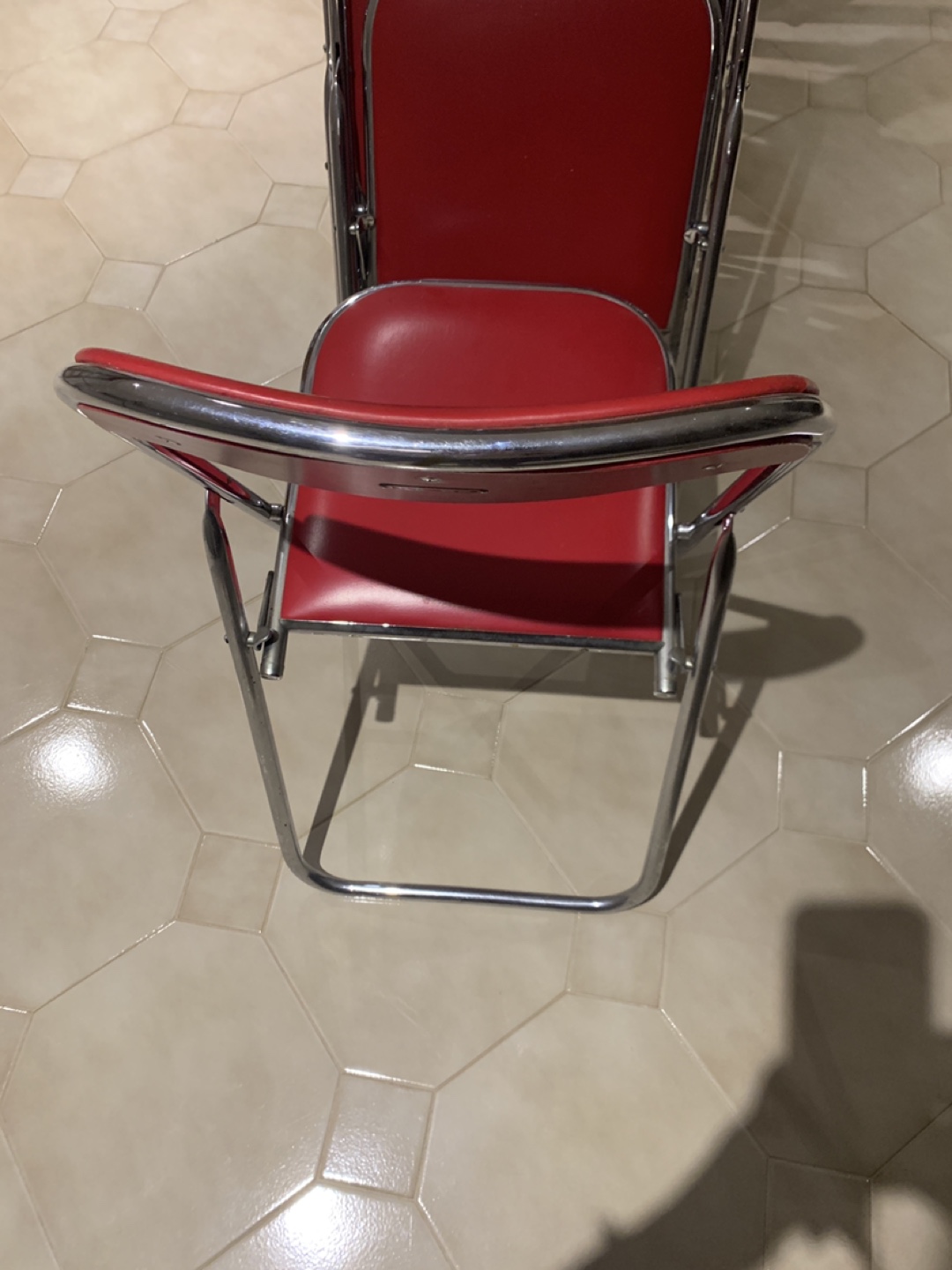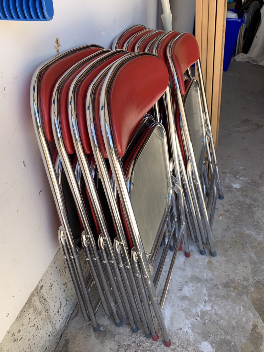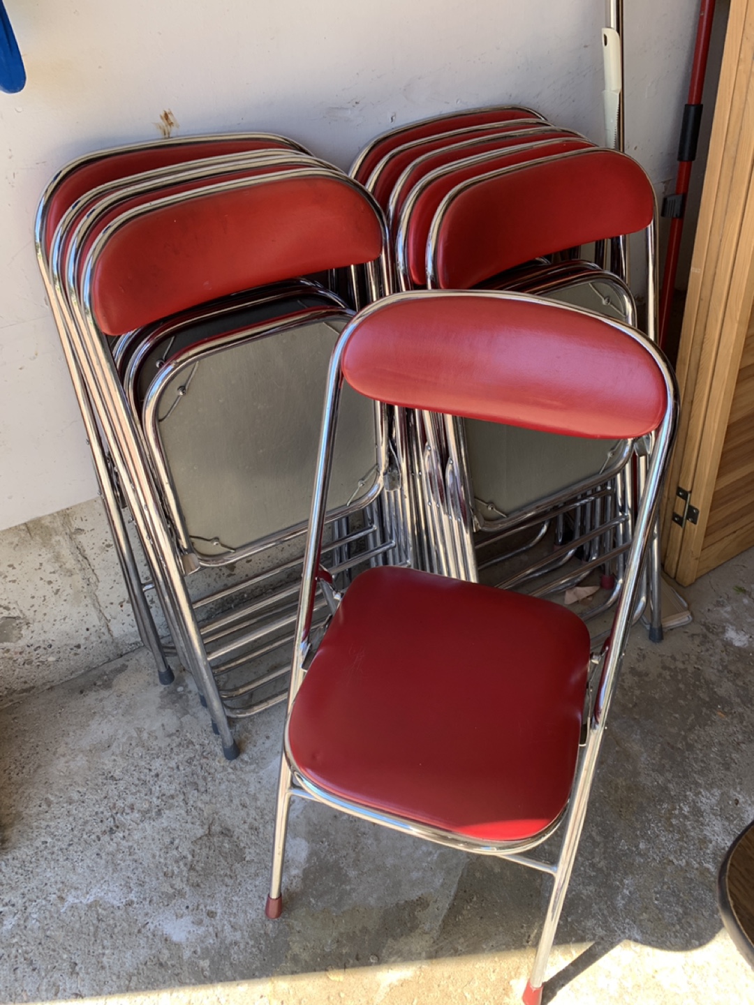 Red faux leather cover with metal structure folding chairs (total 4 for sale), perfect for extra seating and easy to store.