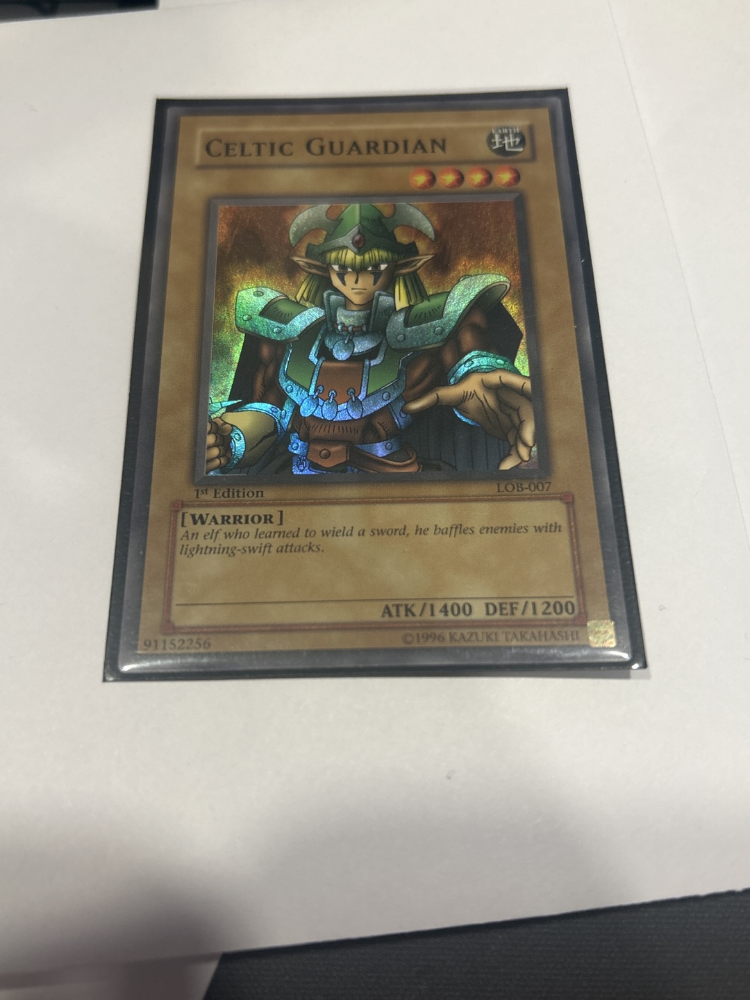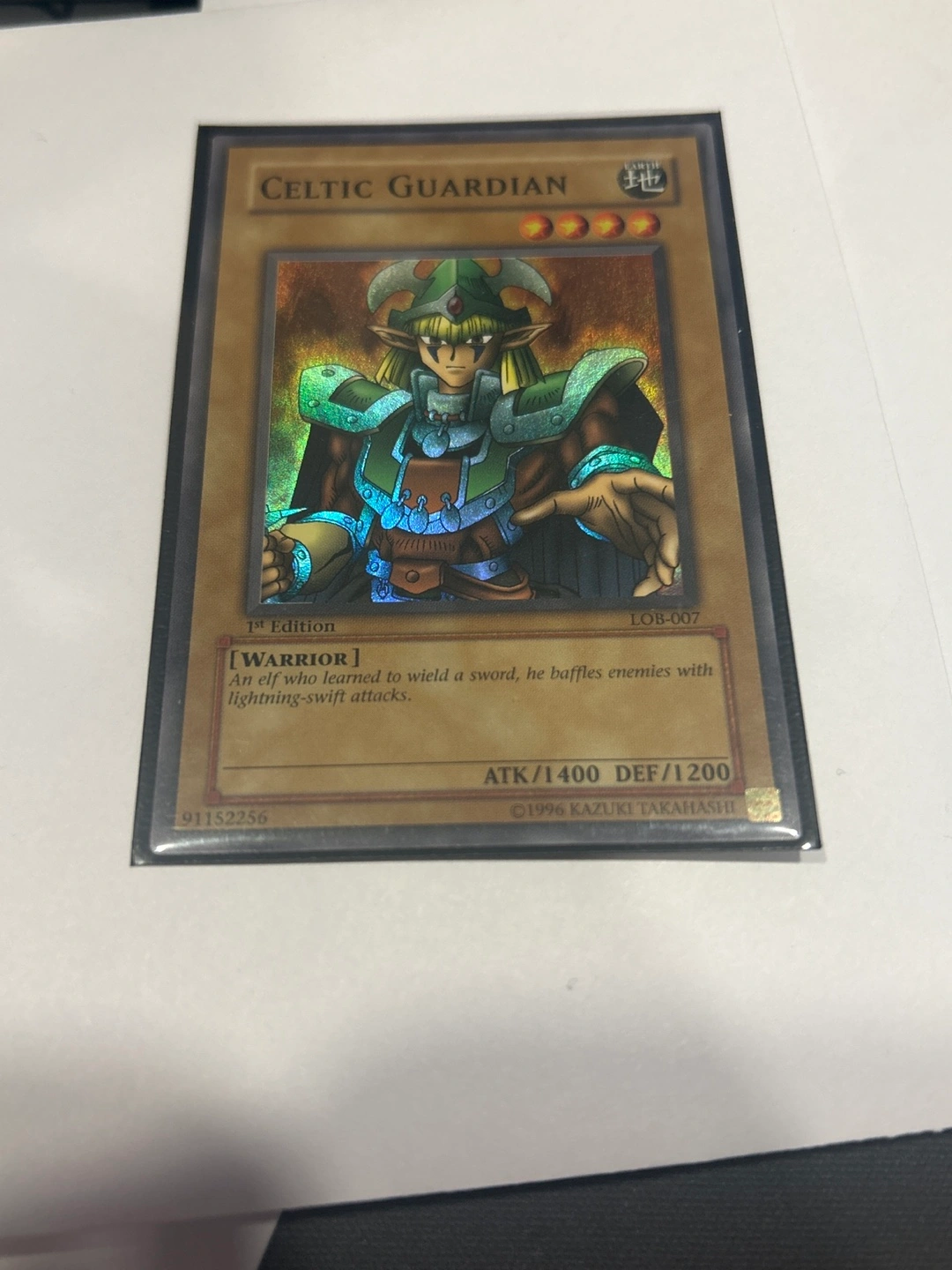 Selling a Celtic Guardian Yu-Gi-Oh! card. It's a 1st Edition LOB-007 card. A great addition to any collector's set! The card features an elf warrior who uses lightning-swift attacks.