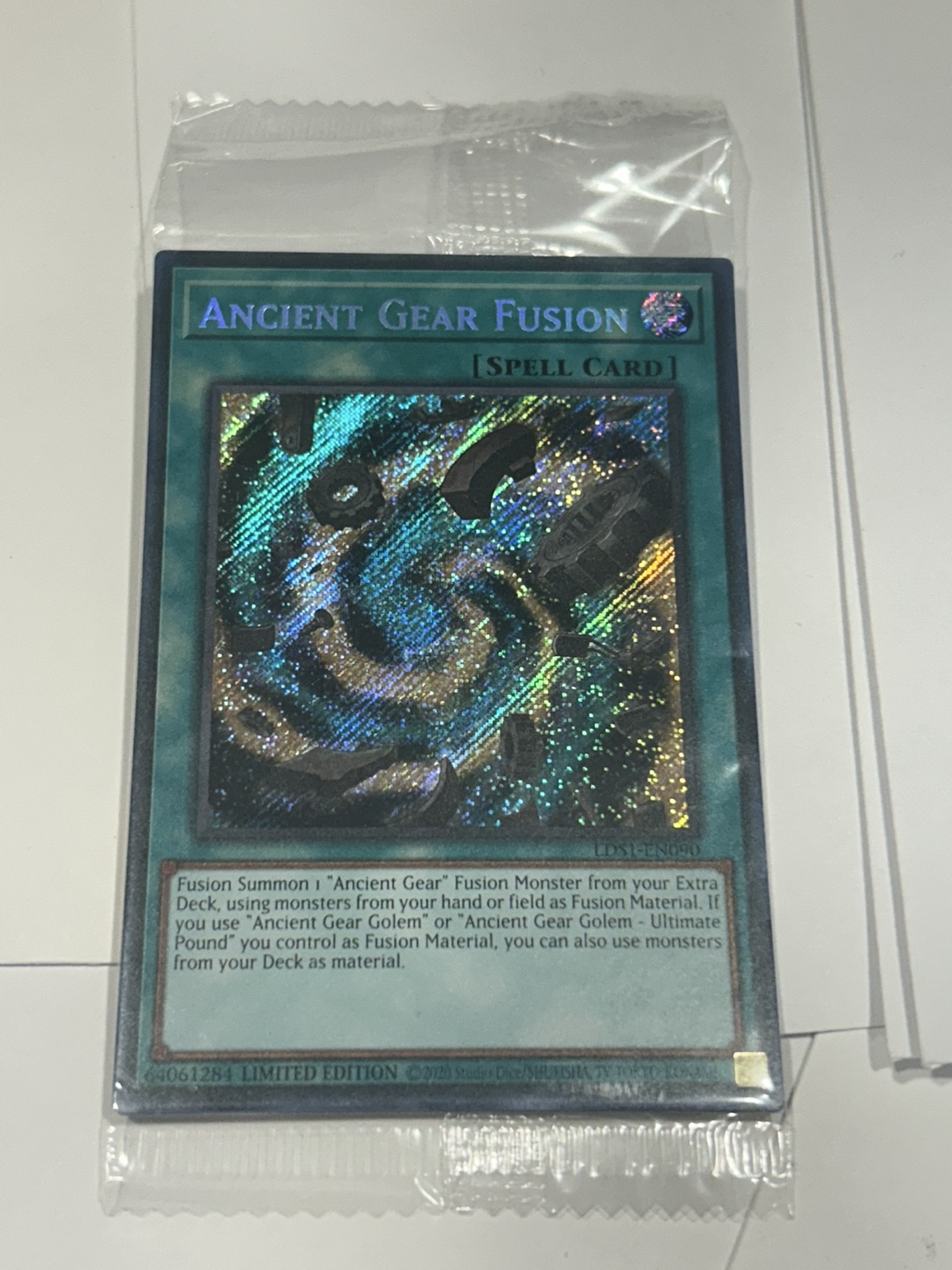 Selling an Ancient Gear Fusion spell card from Yu-Gi-Oh! It's a limited edition card from 2020 and is in great condition. Perfect for any collector or player looking to enhance their deck!