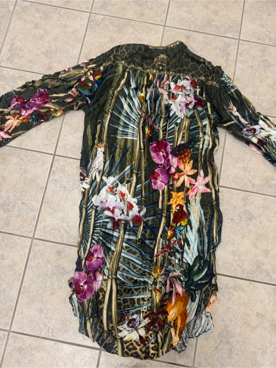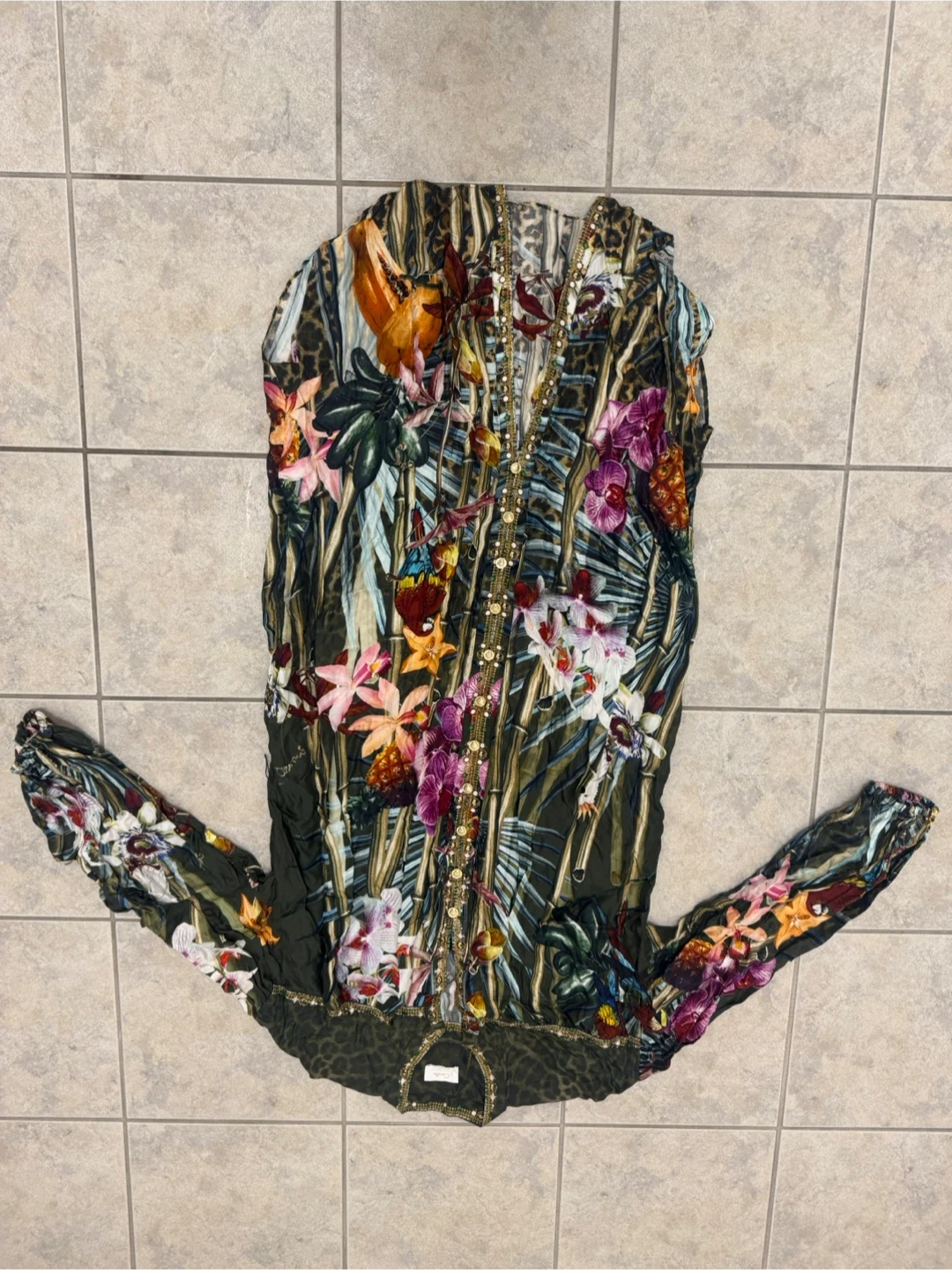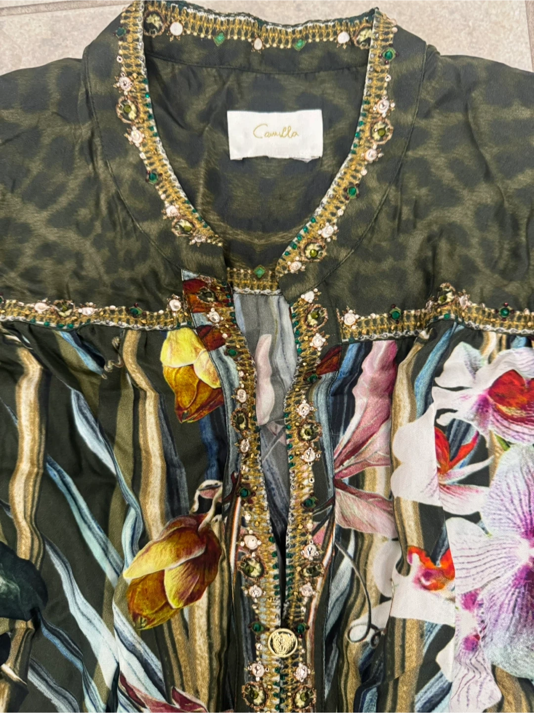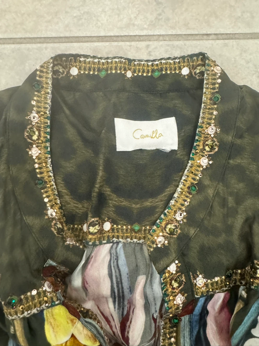 Beautiful Camilla dress with a unique print and detailed embellishments. It's in great condition and ready for a new home! 100% Silk Made in India Cash Pick up near Lawrence and Keele