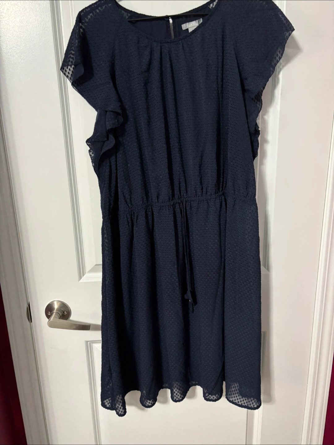 This is a navy blue dress from Zara. It features a drawstring waist and a textured dot pattern. It's in great condition and ready for a new home!