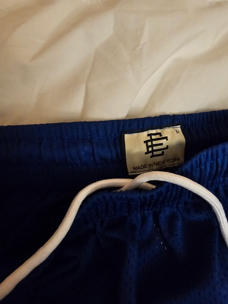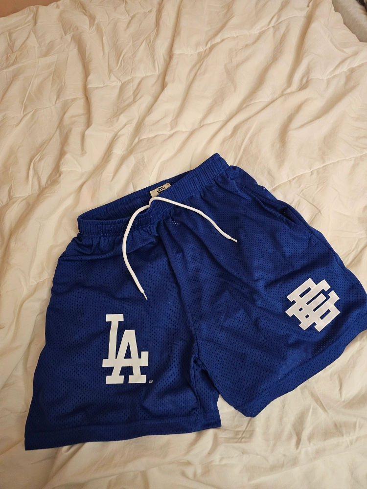 Selling a pair of Eric Emanuel EE LA shorts in blue, size medium. These shorts feature the LA logo and the EE logo. Great for casual wear or sports!