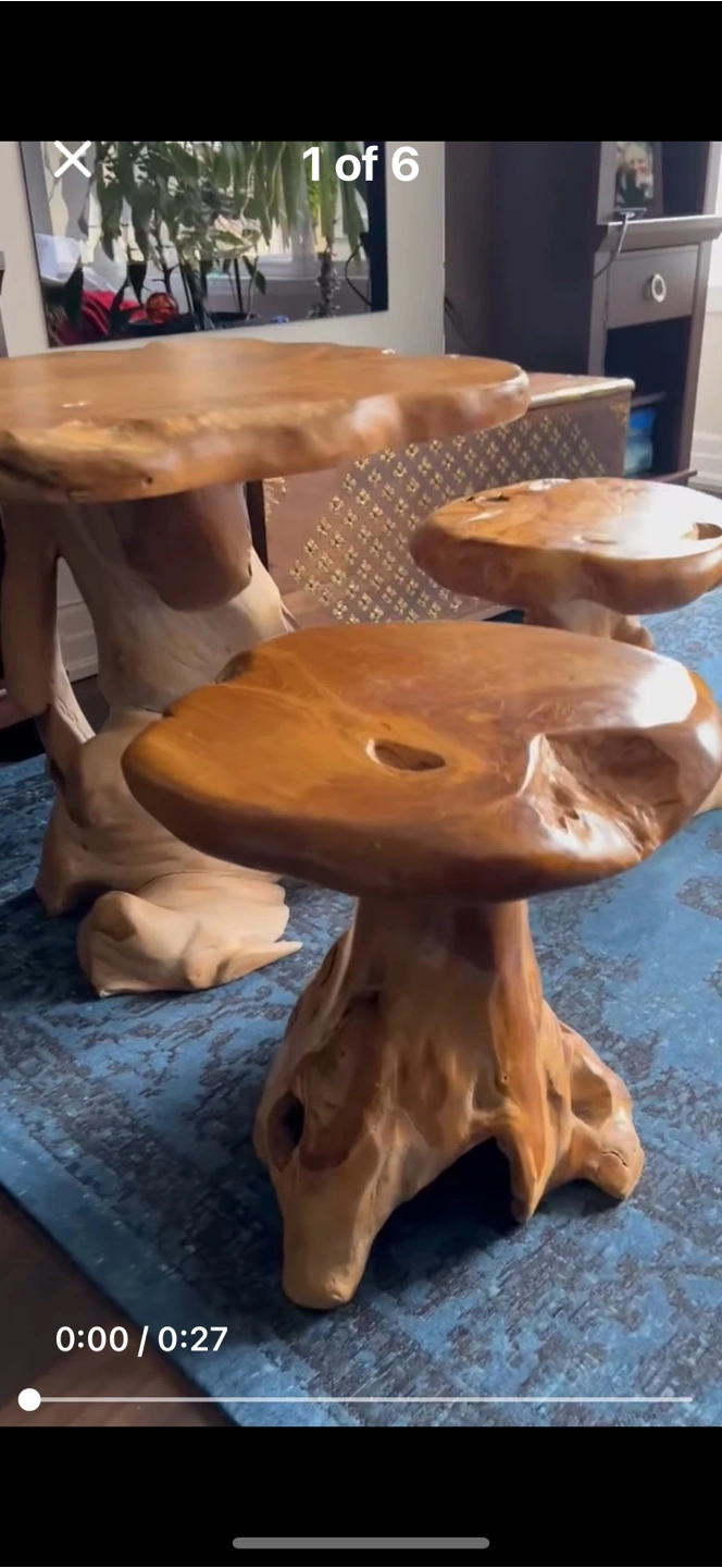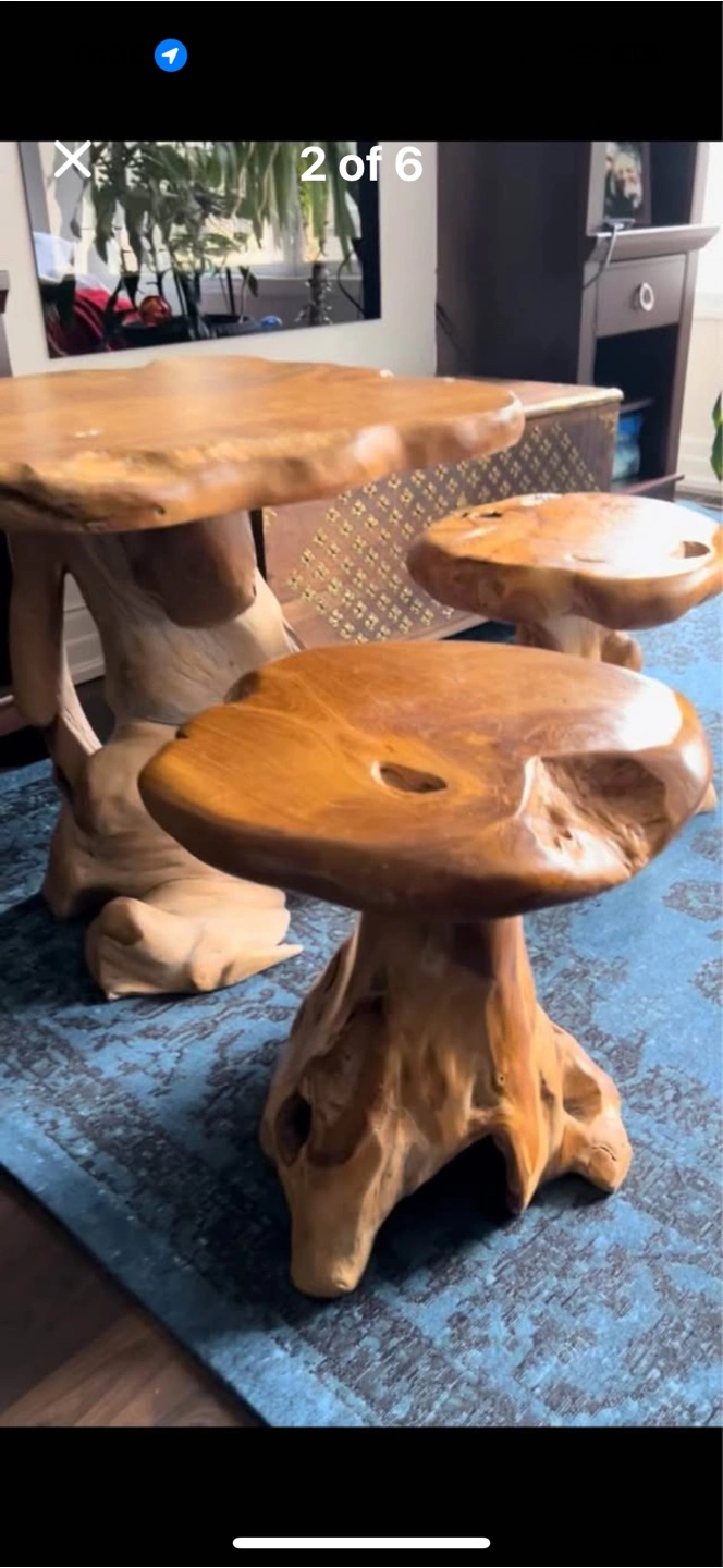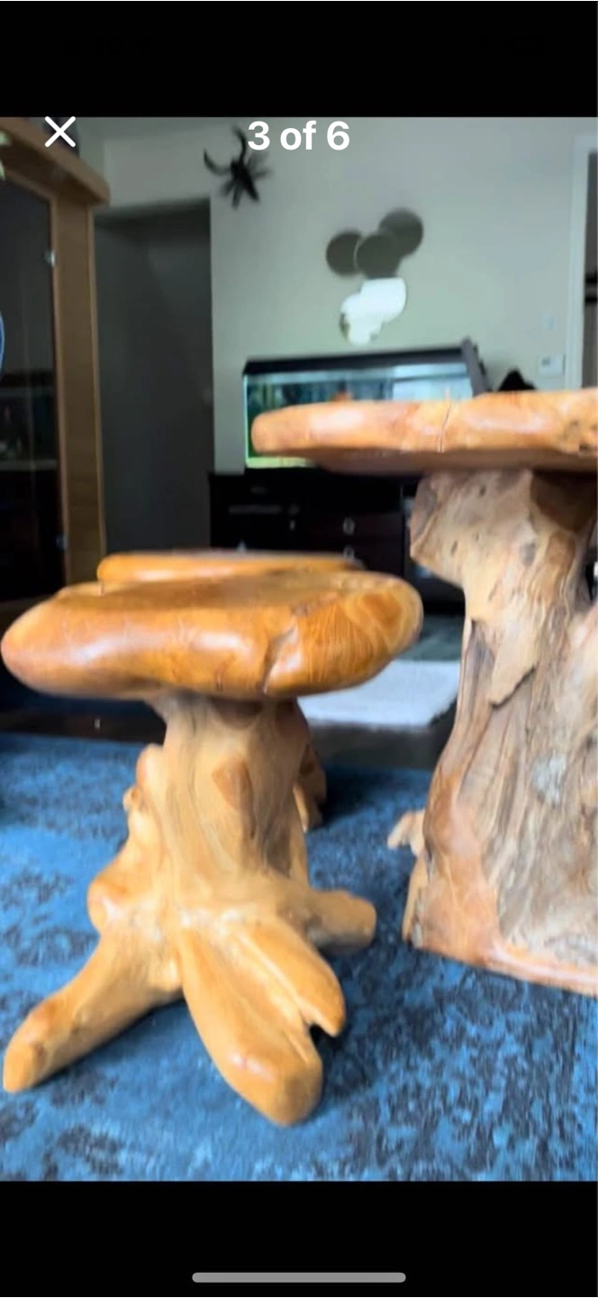 Selling a set of three unique wood stump side tables made for children. They have a natural, rustic look that would add a cool touch to any room. They're in great shape and ready for a new home! Imported items from Primitive Designs in Orono.