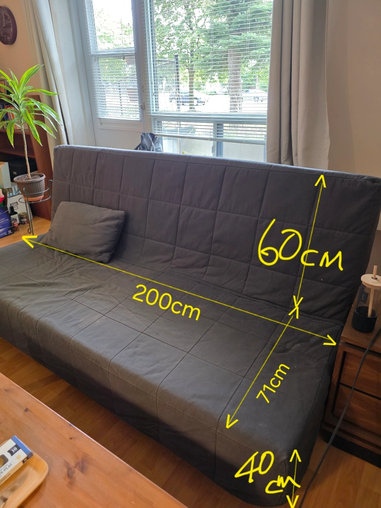 45I'm giving away a dark grey futon that easily converts into a bed. It's in good shape and would be perfect for a living or guest room. The dimensions are approximately 200cm in length, 60cm in height, 71cm in depth (as a sofa), and 40cm.