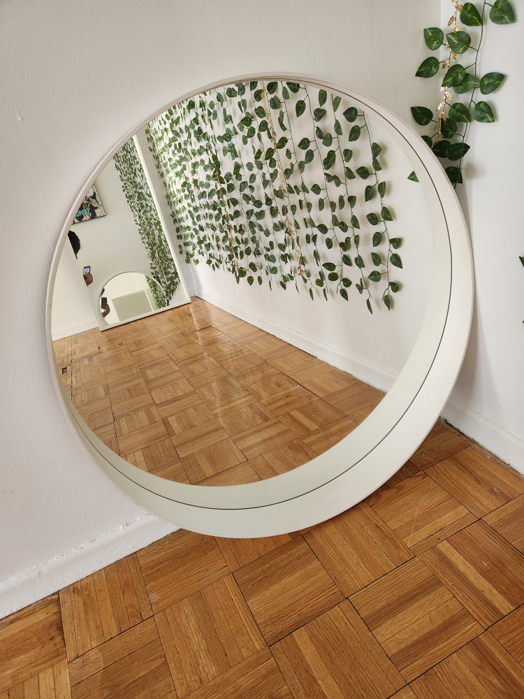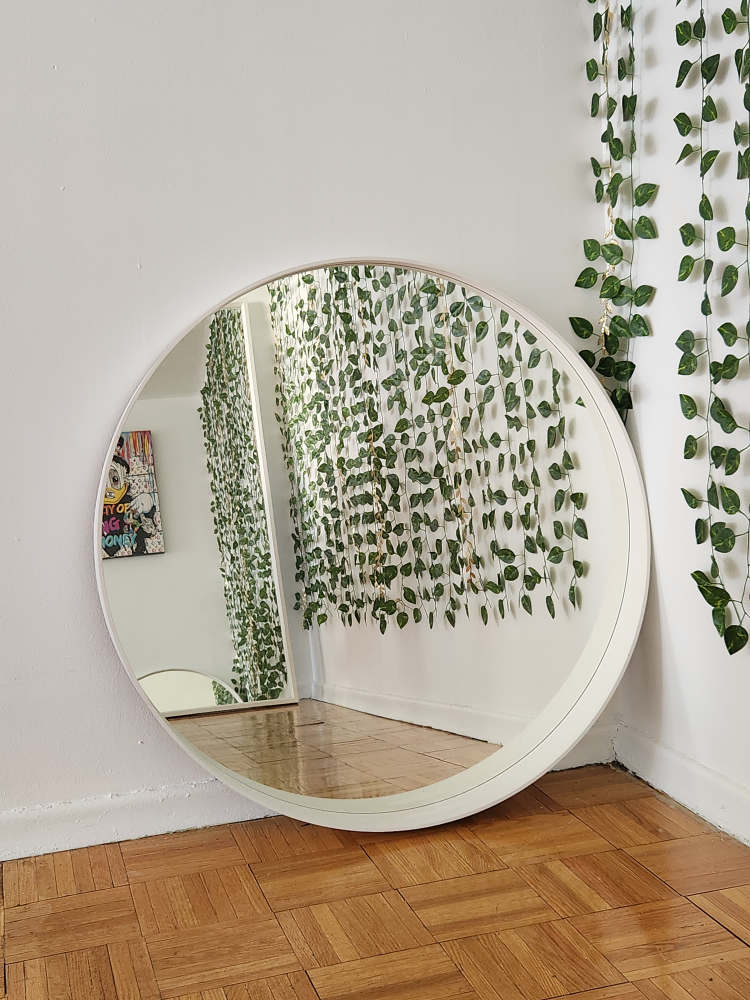Selling a lovely round wall mirror with a clean white frame. It's in great condition and would look fantastic in any room. The mirror is perfect for adding a touch of style and brightness to your space. It's ready to bring a fresh look to your home!