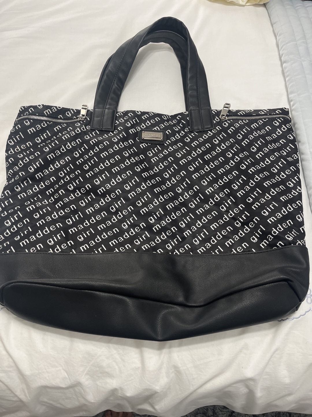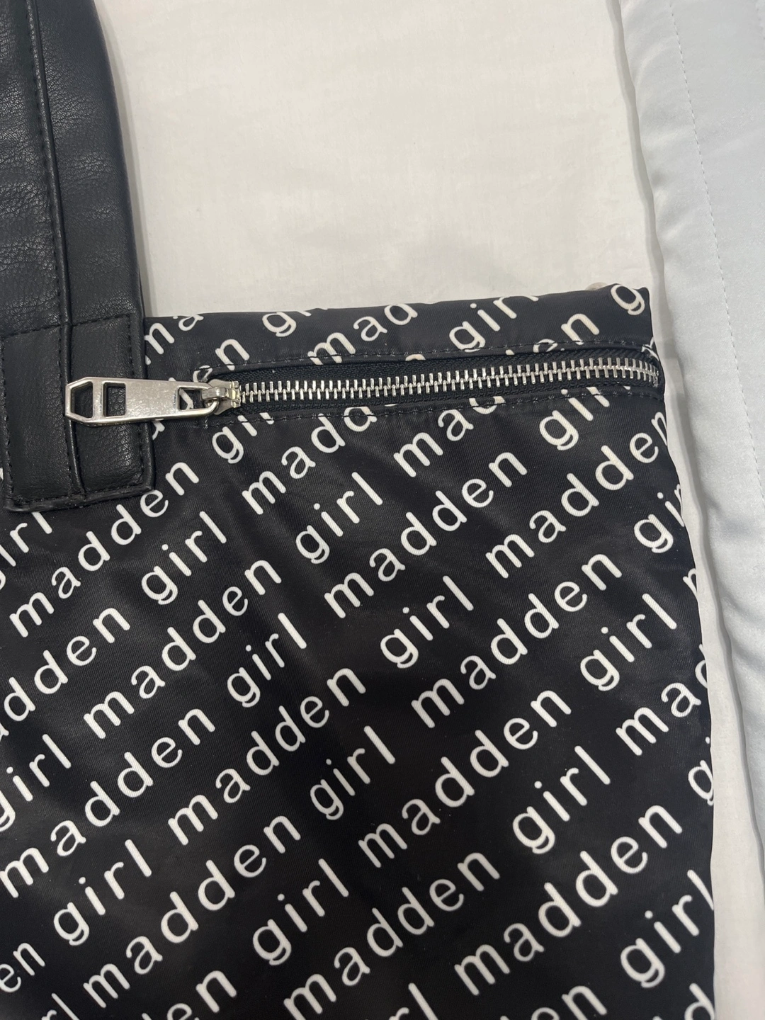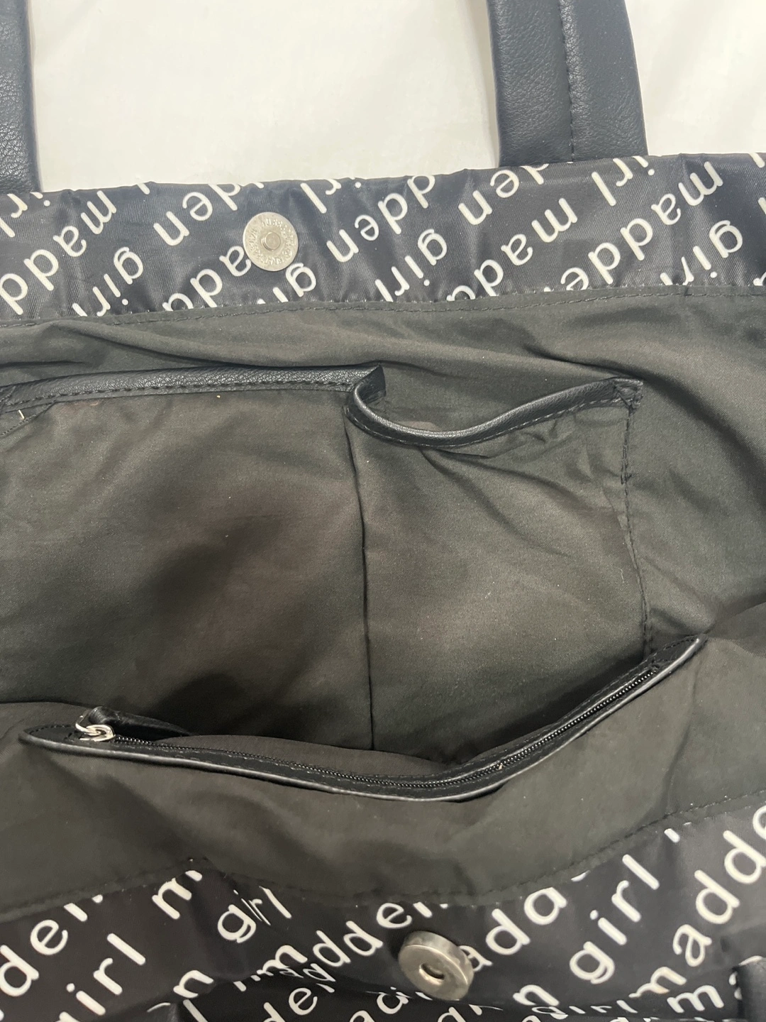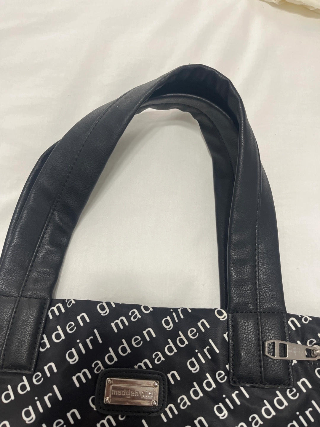 This is a Madden Girl tote bag in black and white. It's in excellent condition and features the "madden girl" logo printed all over. The bag has black handles and a black base, with a zippered pocket inside and additional pockets for phone etc.