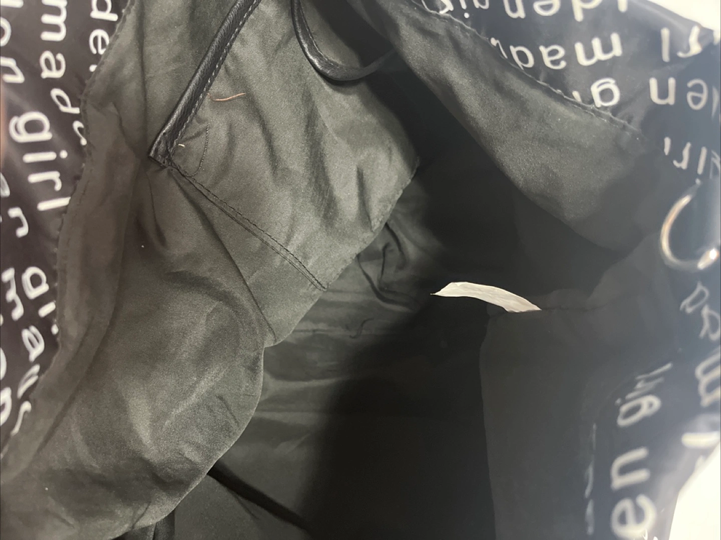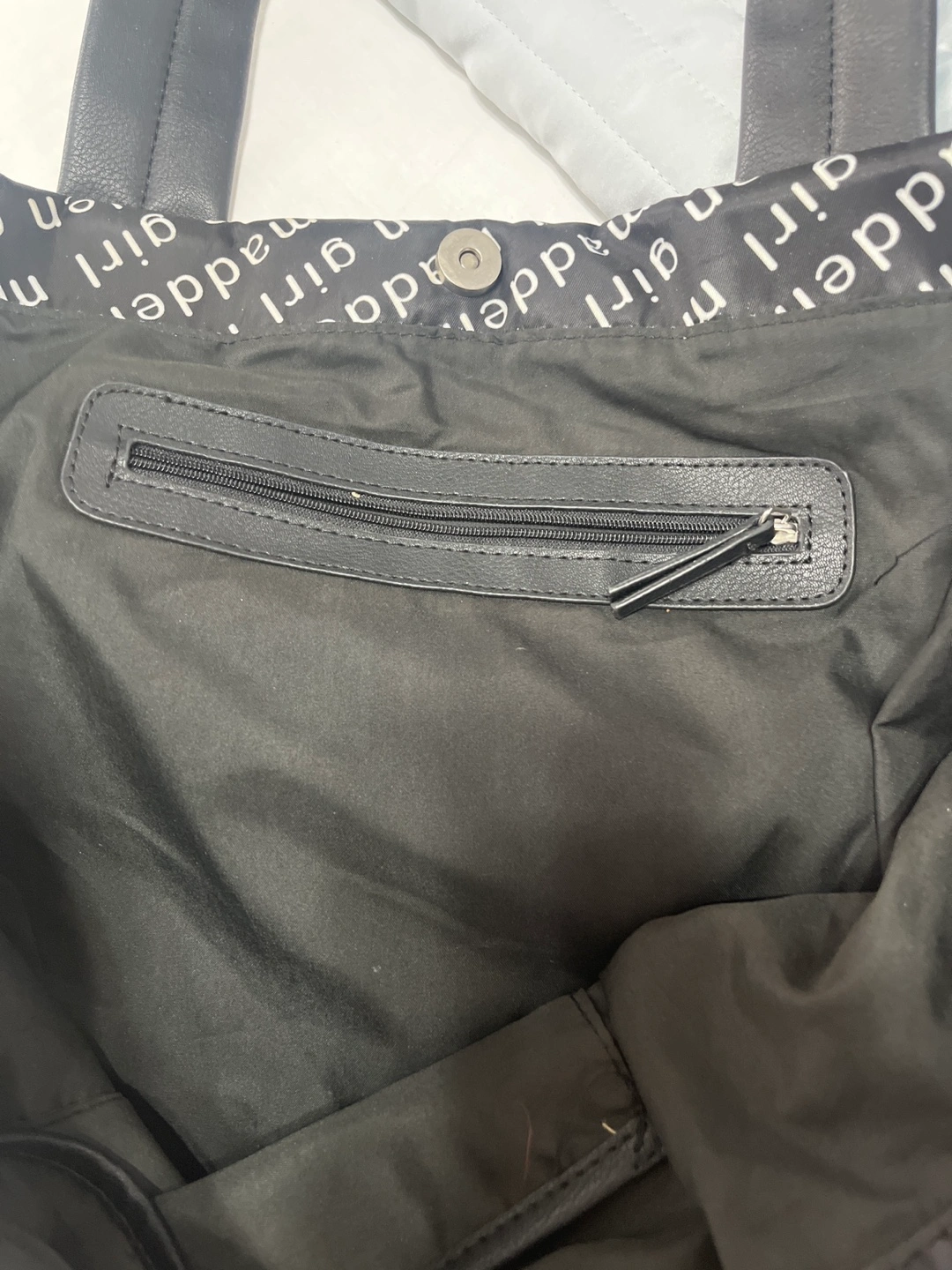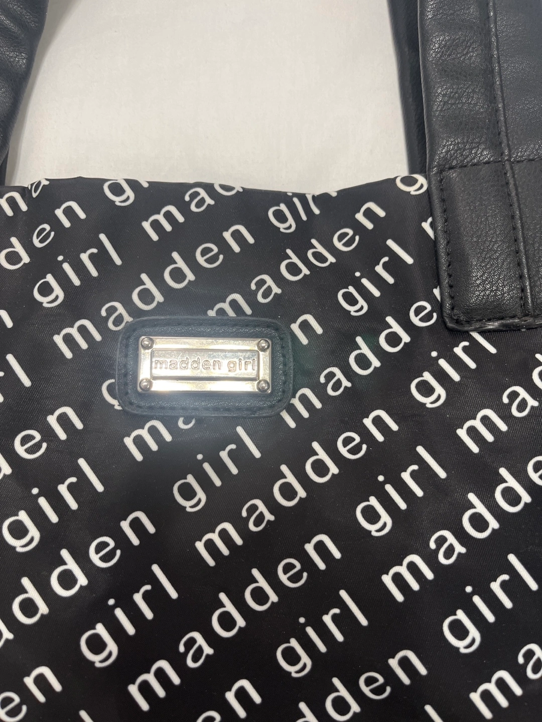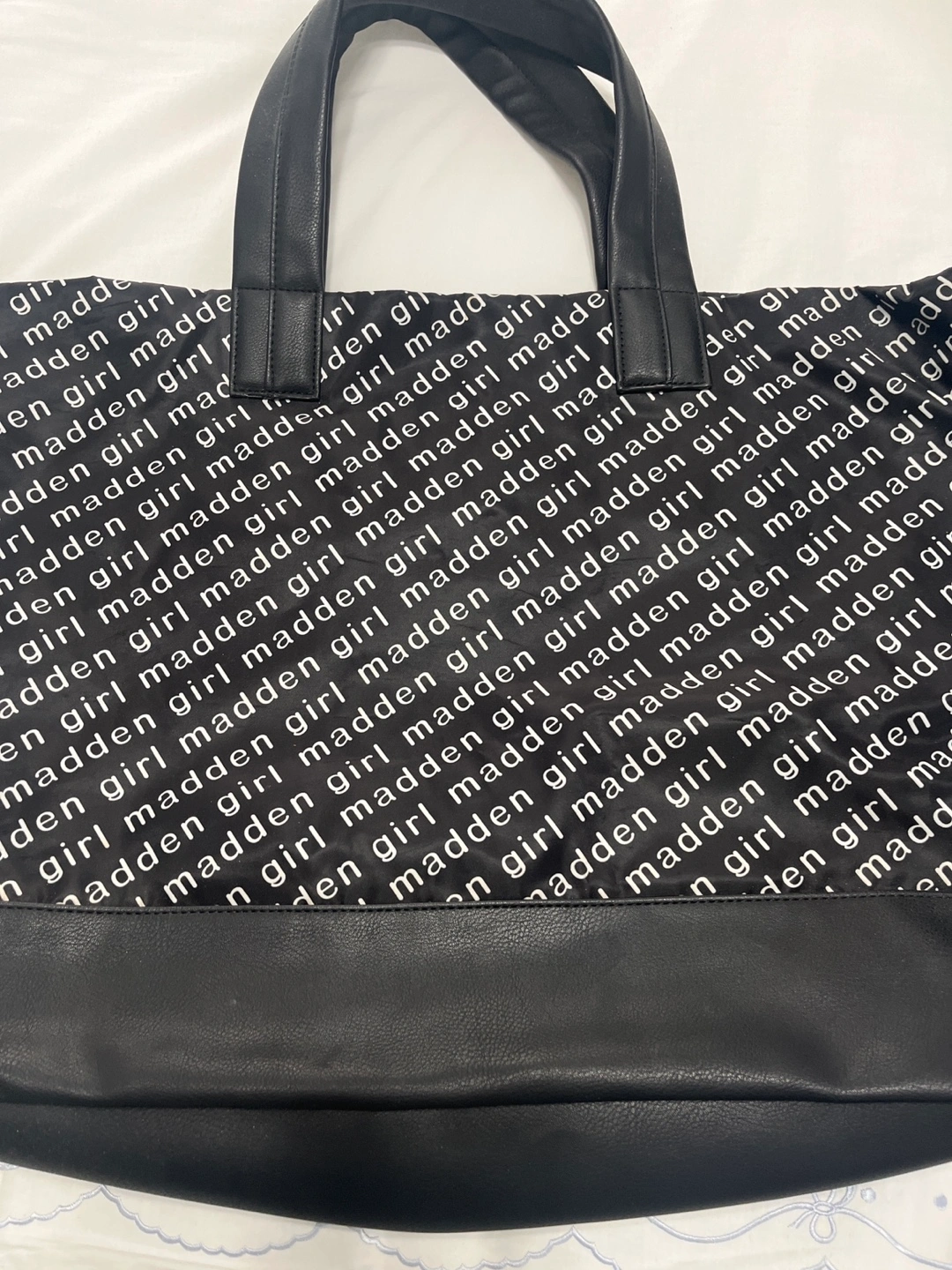 This is a Madden Girl tote bag in black and white. It's in excellent condition and features the "madden girl" logo printed all over. The bag has black handles and a black base, with a zippered pocket inside and additional pockets for phone etc.