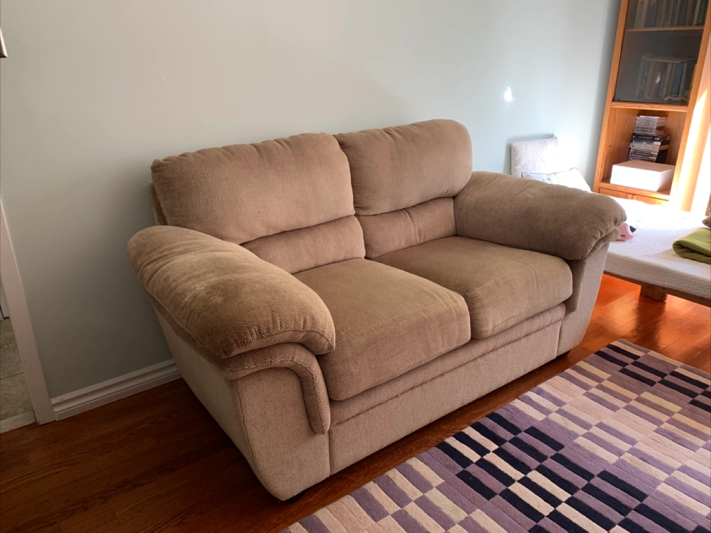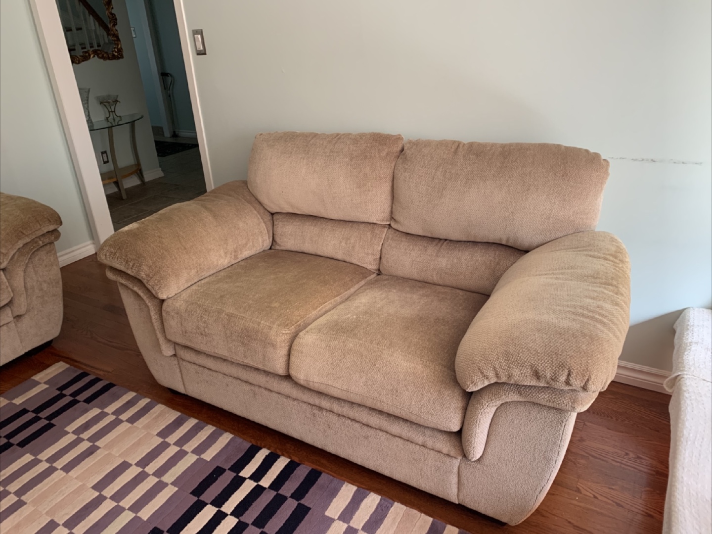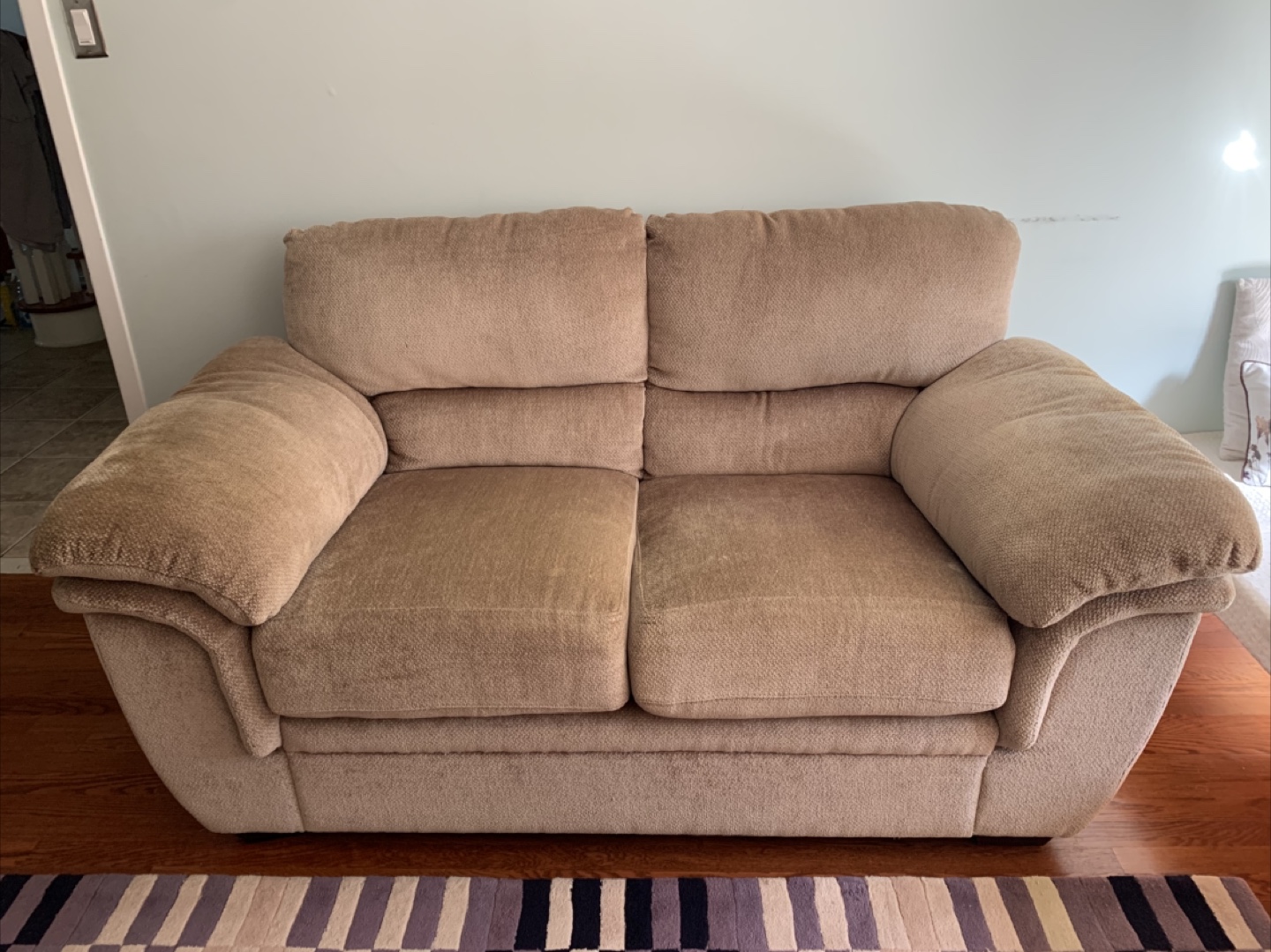 Selling a comfortable loveseat sofa in a neutral beige fabric. Very well taken care of and seats are holding up well. Comfortable to sit on and can make a nice addition to your home. From a smoke and pet free home.
