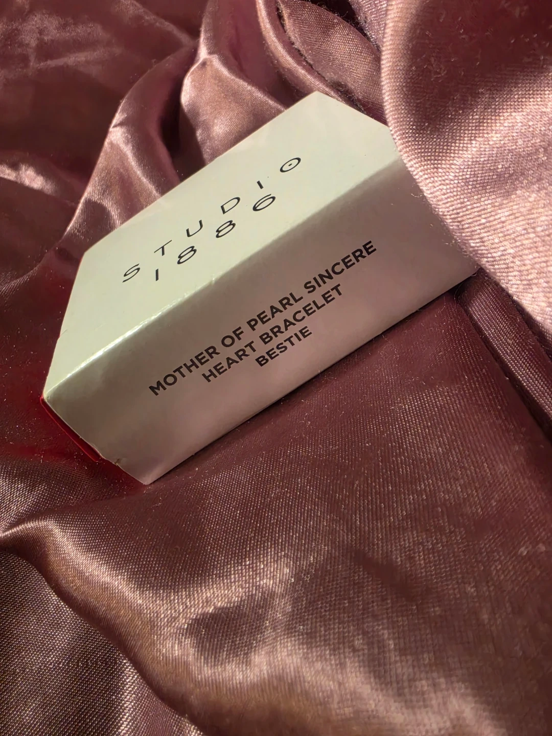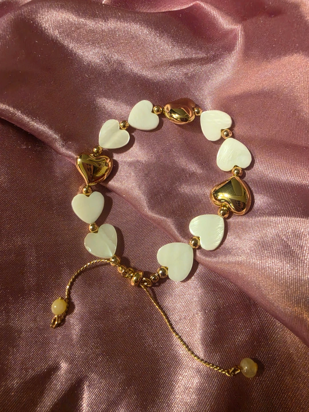 Mother of Pearl Sincere Heart Bracelet Bestie. It's a dainty bracelet with white heart-shaped mother of pearl and gold-tone heart charms. Adjustable string closure.