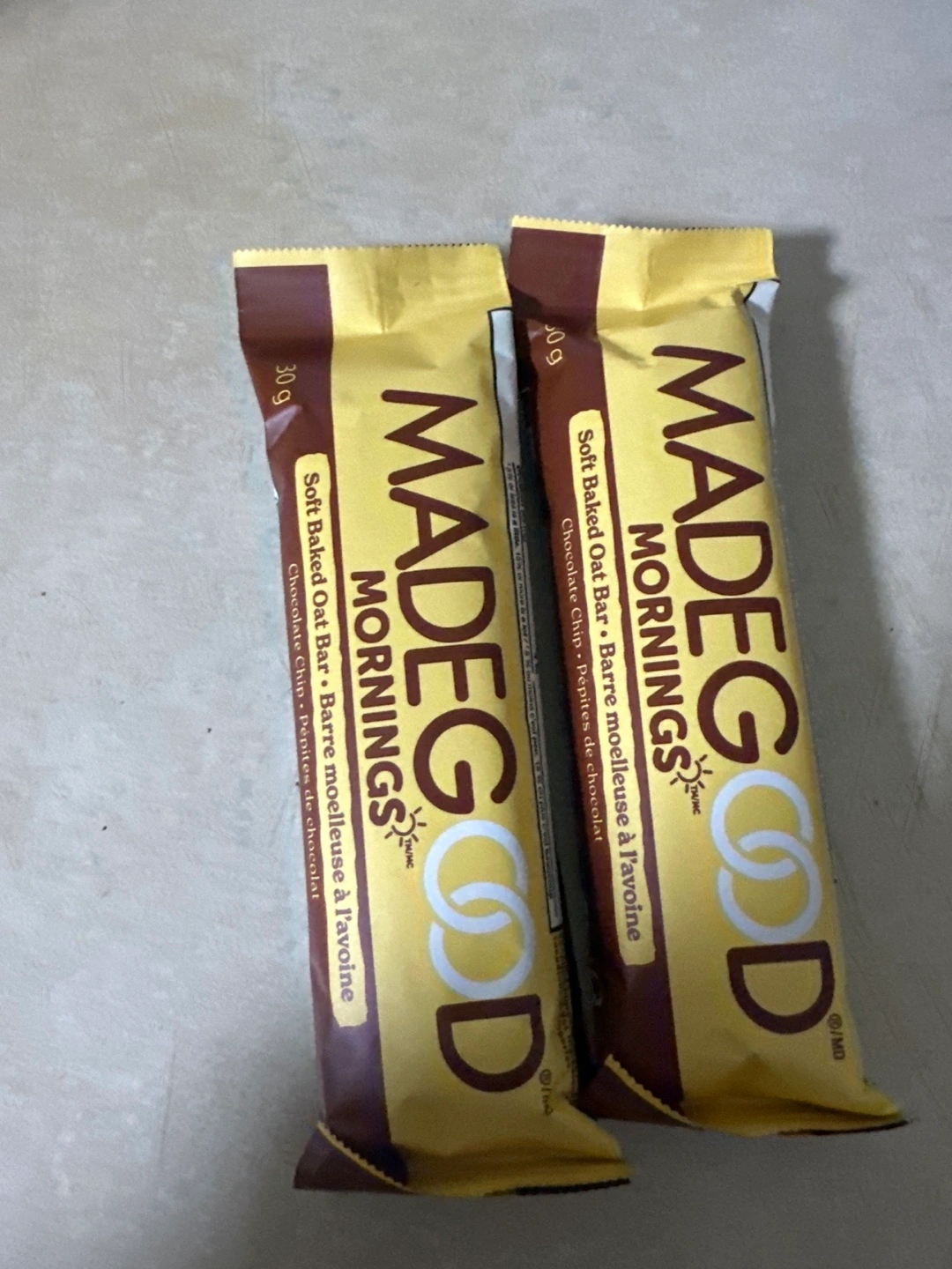 Two MadeGood Mornings Soft Baked Oat Bars in chocolate chip flavour, yum! These are perfect for a quick and tasty snack or a little treat on the go. Each bar is 30g. Enjoy!
