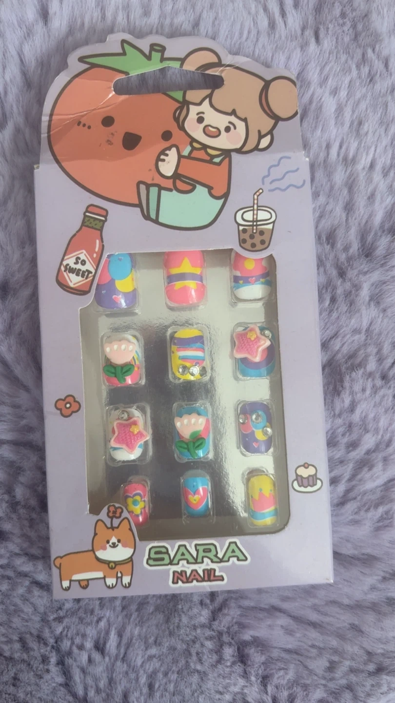 These are a set of Sara Nail press-on nails for kids! They come in a super cute box with various designs. Perfect for a fun and easy manicure at home