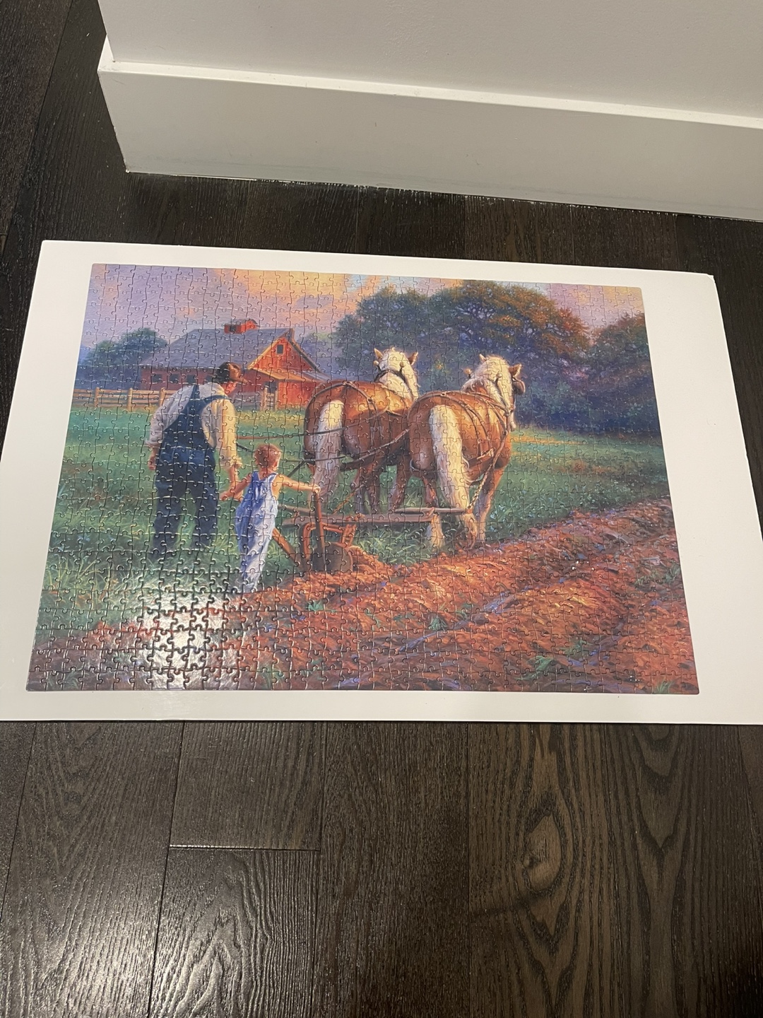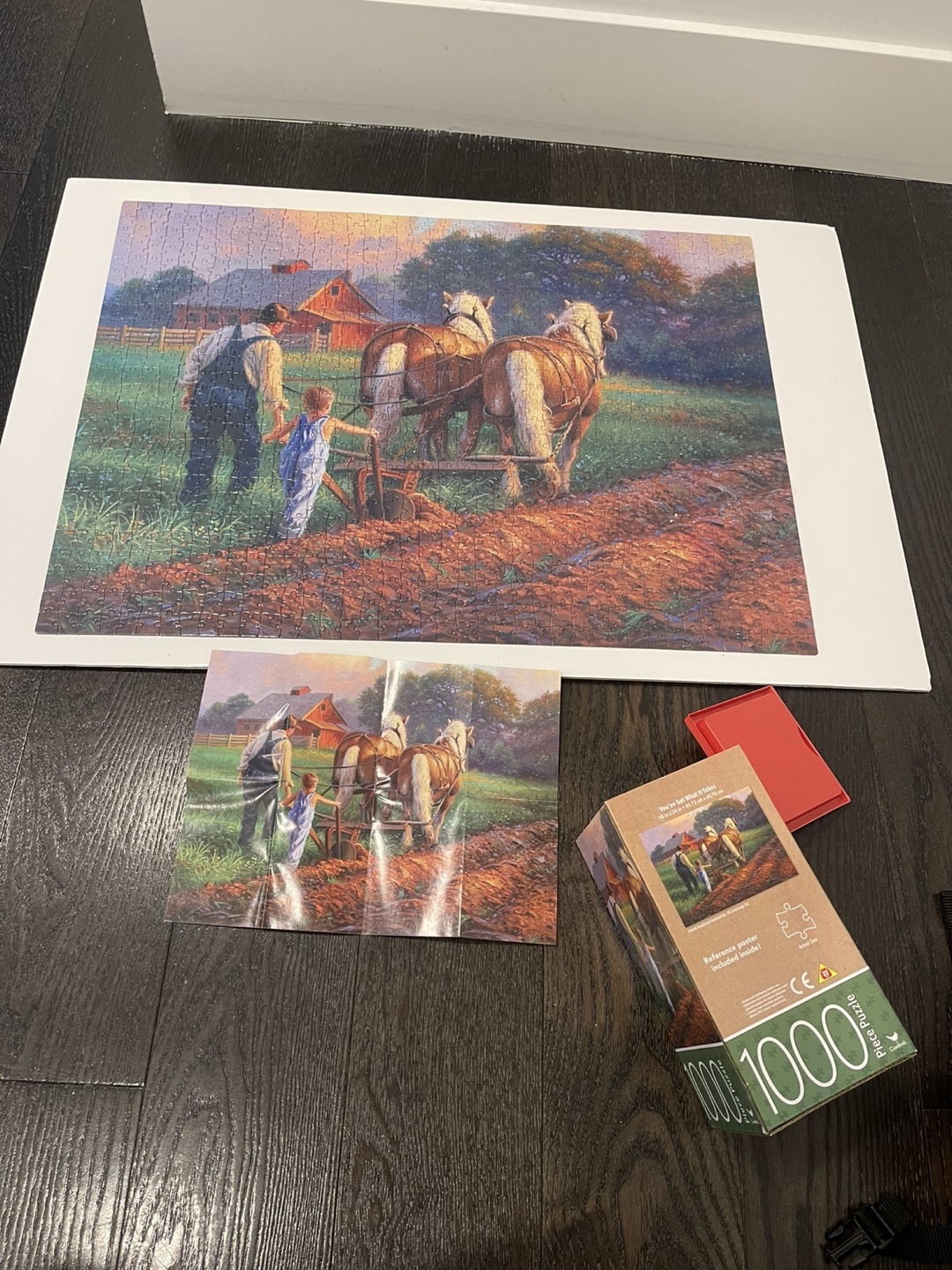 Selling a 1000 piece jigsaw puzzle. It's a lovely picture of horses plowing a field. Includes the box and a reference picture to help you complete the puzzle