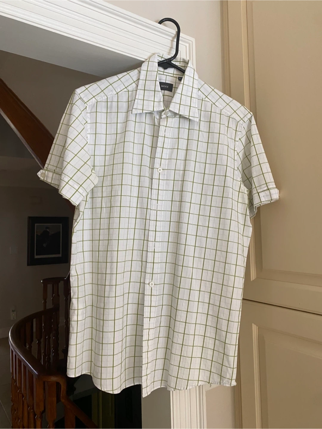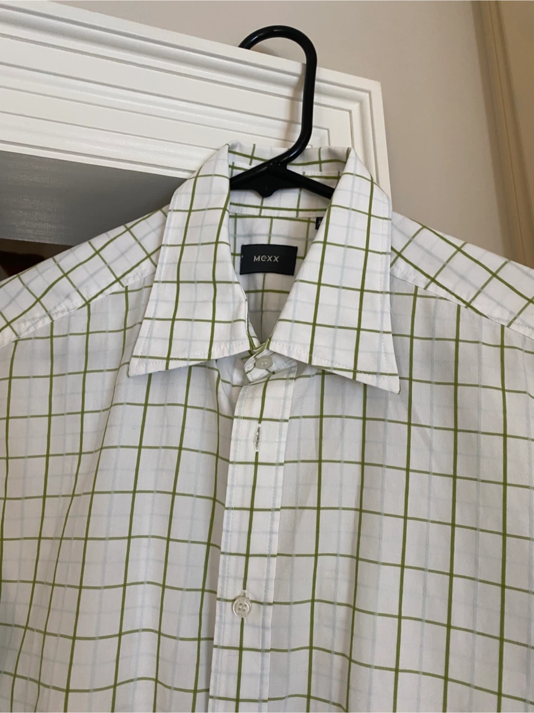 Here's a stylish MEXX shirt that would look great in your wardrobe! It features a clean white base with a subtle green checkered pattern. Perfect for a casual yet put-together look. Size is Medium