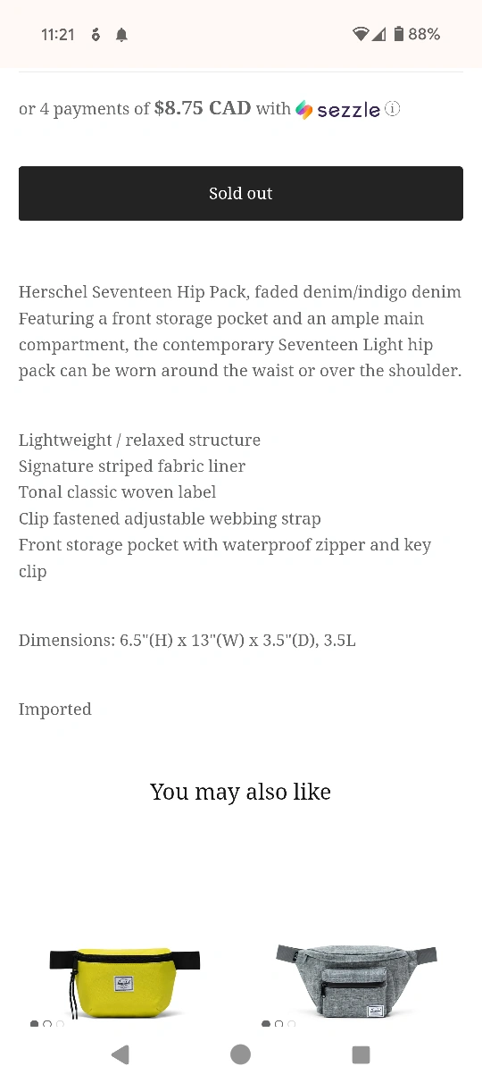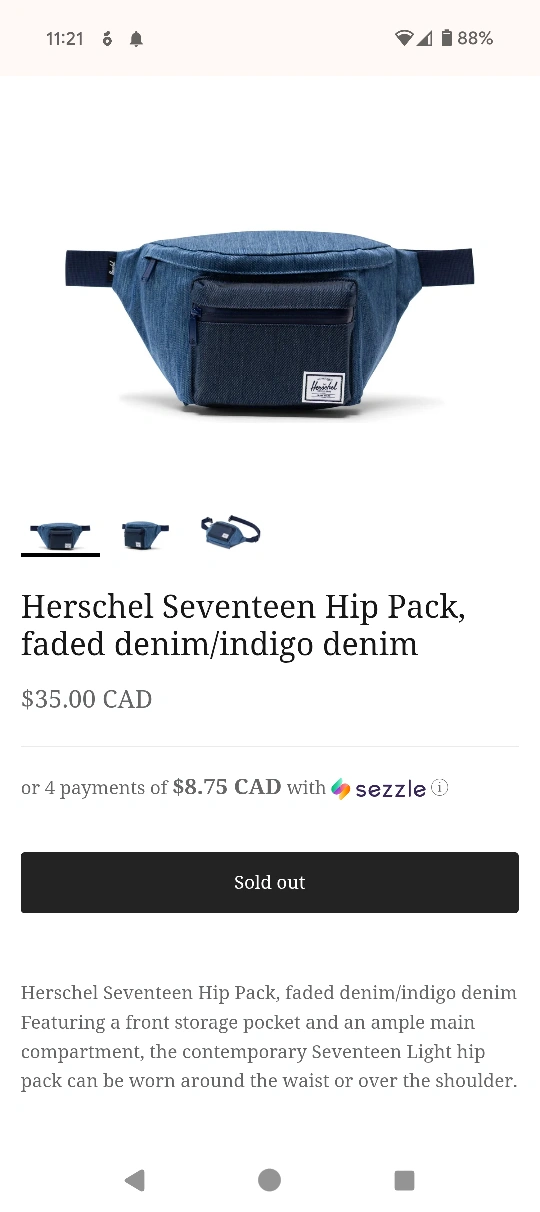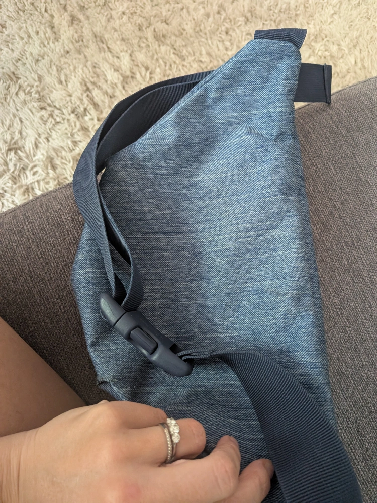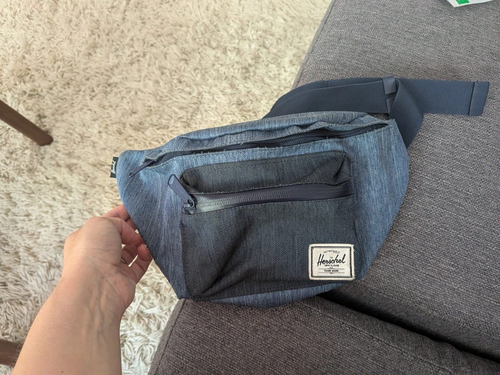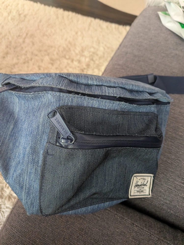 used Herschel Fanny pack in denim blue colour. fits a ton with large zippered compartment and smaller outside one. could use a gentle wash (can do that before sale if requested) but is in good condition with a lot of use left. we just have too many Fanny packs lol