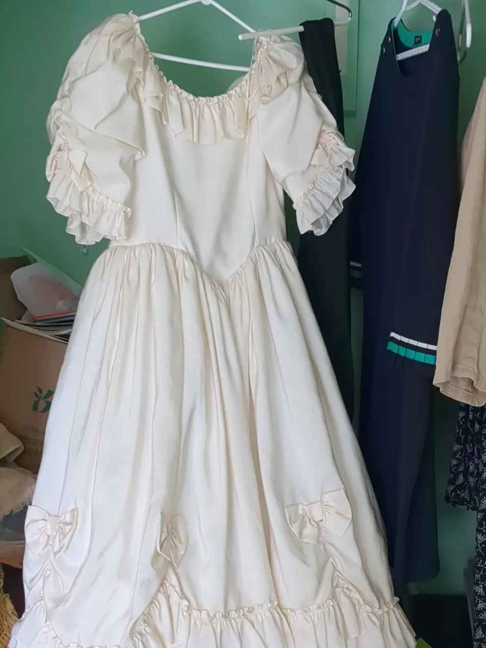 A lovely cream-coloured dress featuring ruffles and bow details! Perfect for a special occasion or adding a touch of elegance to your wardrobe. Ivory colour, raw silk, size 10. Also great for costumes or theatre productions.