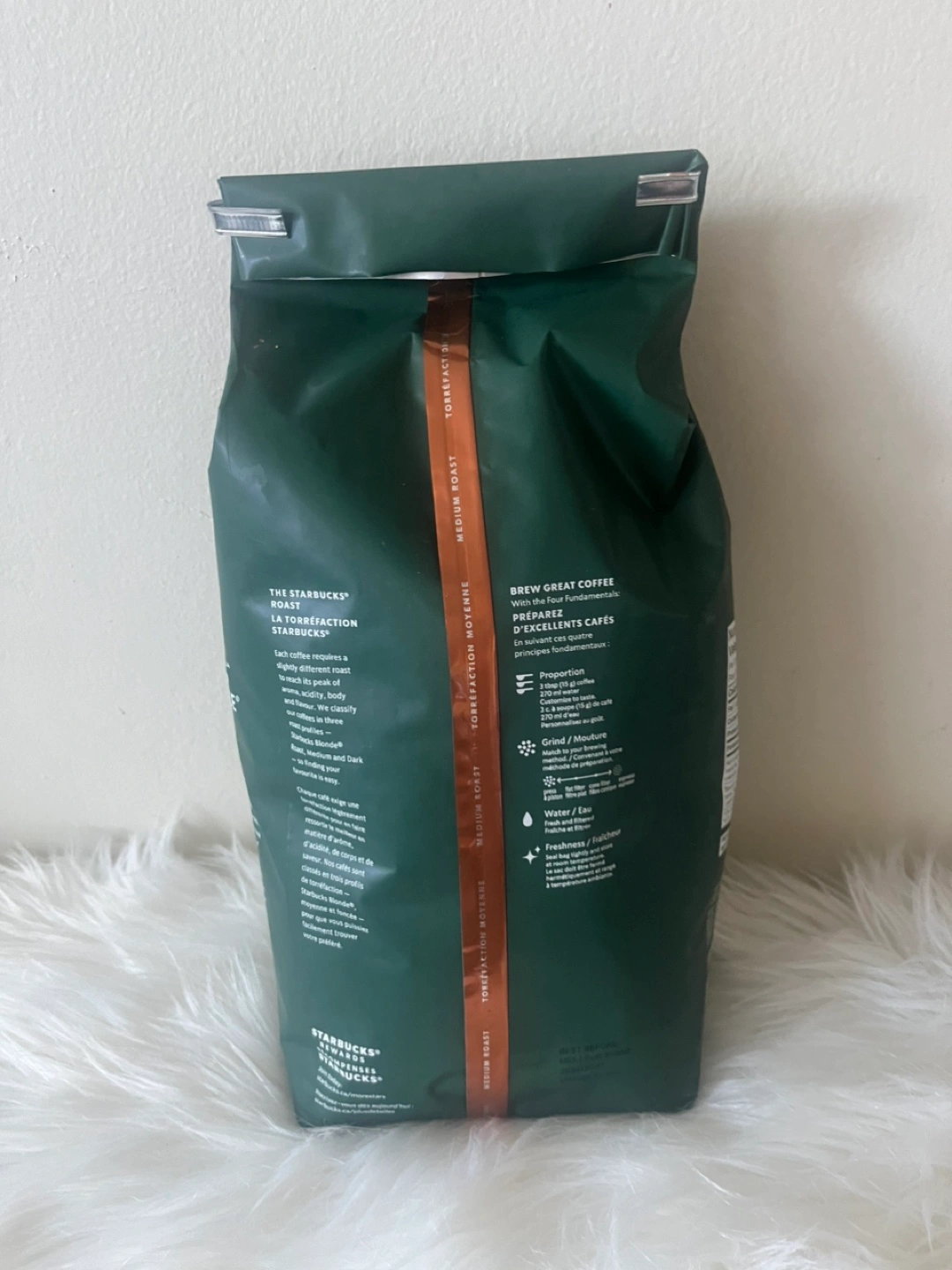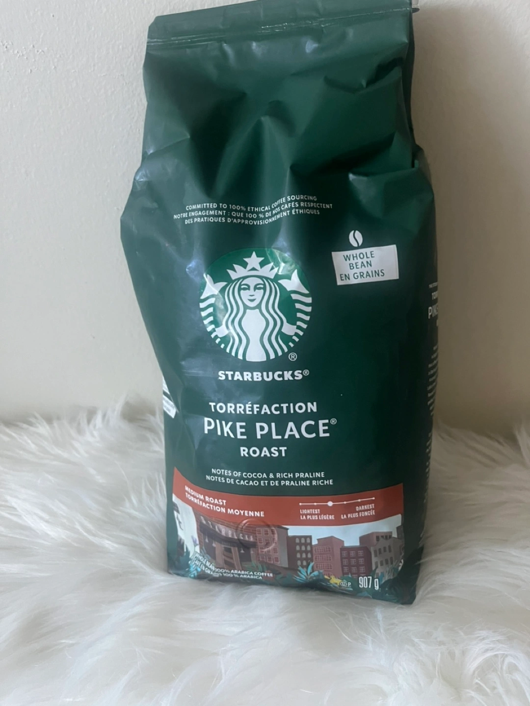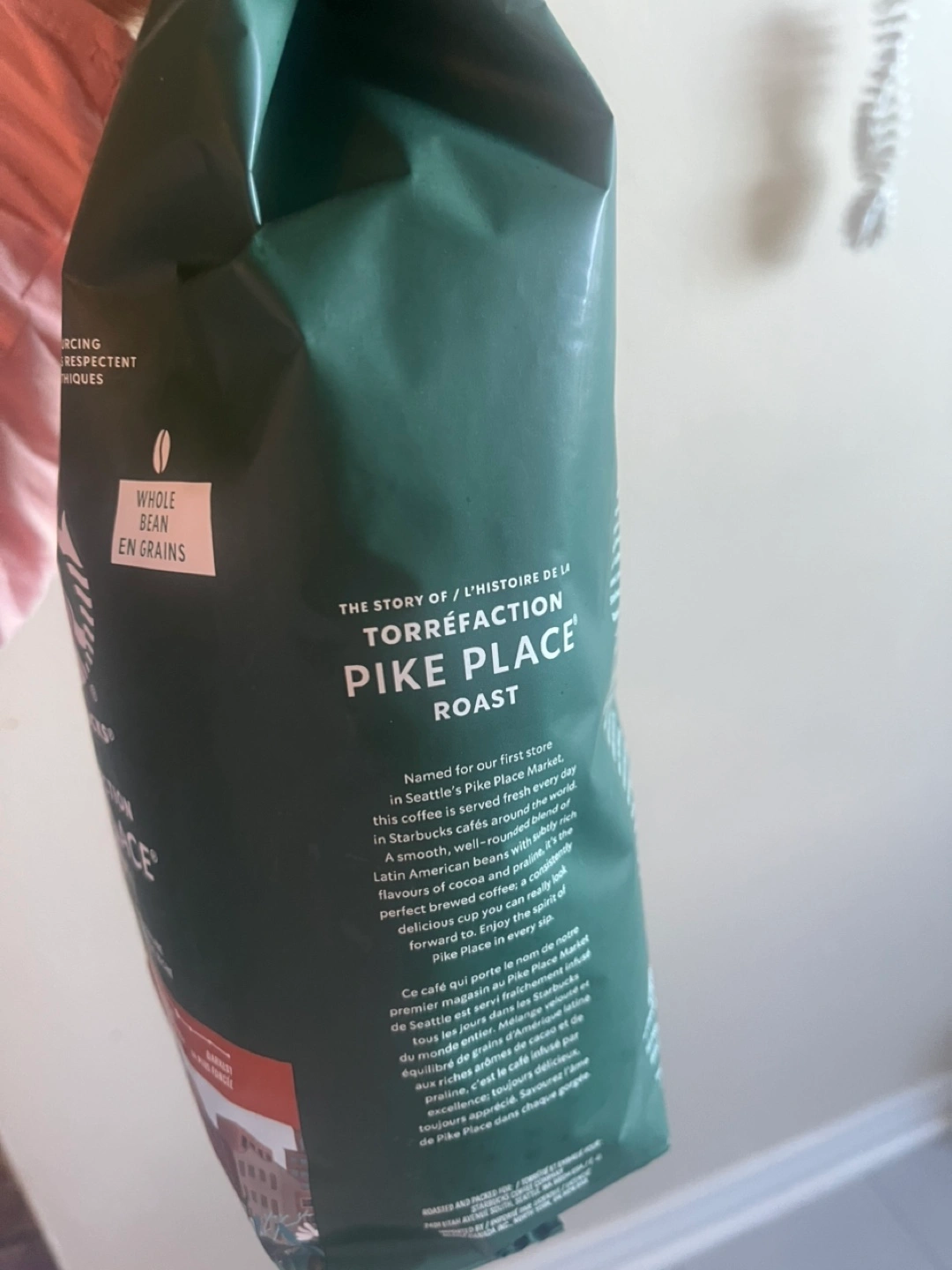 Selling a bag of Starbucks Pike Place Roast whole bean coffee. It's a medium roast with notes of cocoa and rich praline. Perfect for starting your day with a smooth, well-rounded cup of coffee. Enjoy!