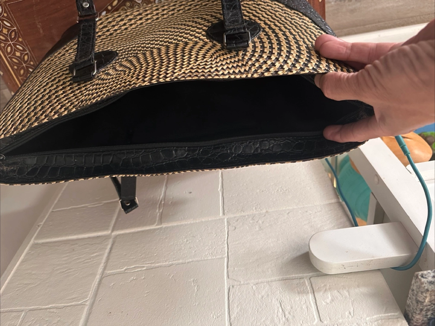 539Here's a stylish woven tote bag with black accents! It's perfect for everyday use and has a unique design. It's in great condition and ready for a new home