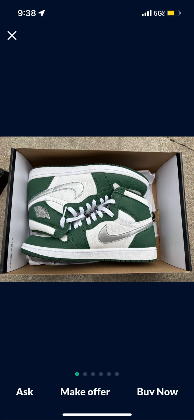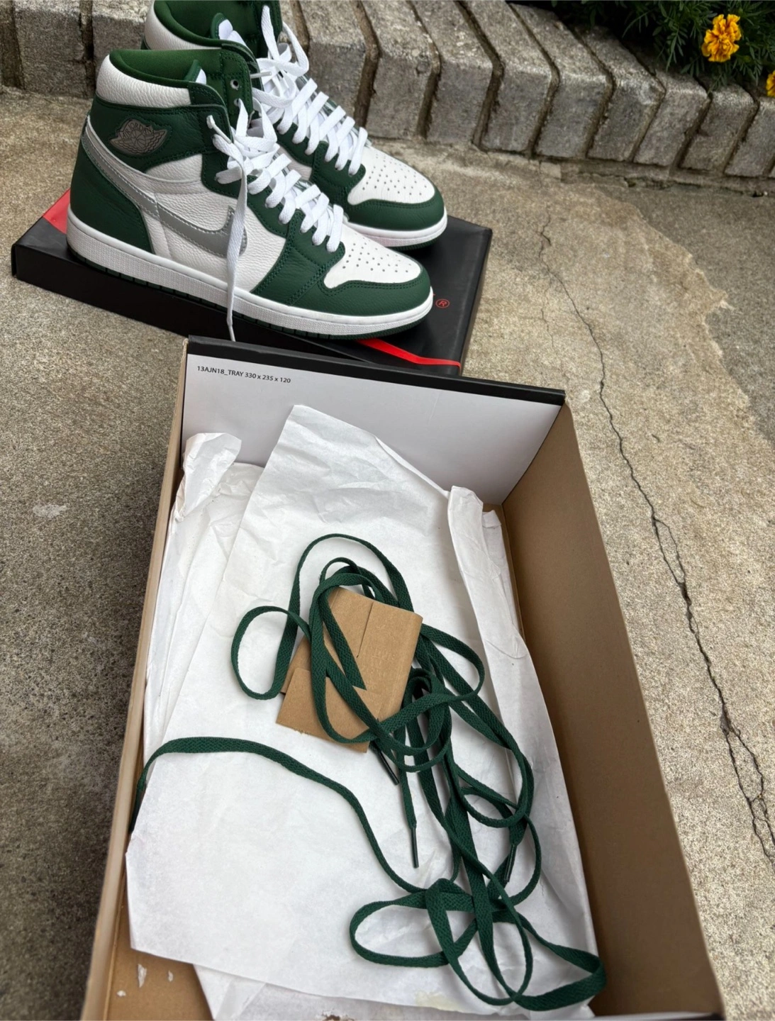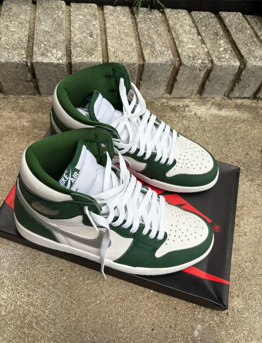 Selling a pair of Nike Air Jordan 1 High in the Lucky Green colorway! These come with the original box and an extra pair of green laces. They are in great condition and ready for a new home!
