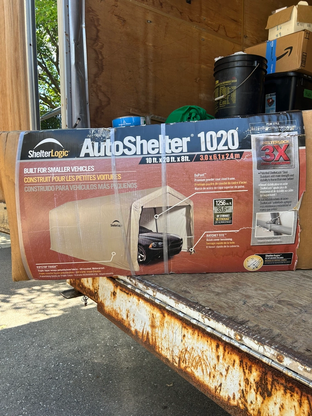 156BNIB ShelterLogic AutoShelter 1020, perfect for smaller vehicles. It's 10 ft x 20 ft x 8 ft (3.0 x 6.1 x 2.4 m). Features a DuPont premium powder coat steel frame and ShelterLock 3X steel stabilizers for added strength and stability. The cover is made of ripstop tough triple-layer woven polyethylene fabric that is UV treated and waterproof. It also has Ratchet Tite quick cover tensioning. Great for storage! Great for storing motorcycles, ATVs, lawn equipment, etc. - Durable all-steel metal frame - Premium powder-coated finish - Waterproof, UV-treated cover - Patented ShelterLock stabilizers - Ratchet-Tite Cover tensioning system - Easy slide cross rail system Solid, reliable storage solution at a great price. Message me if interested!