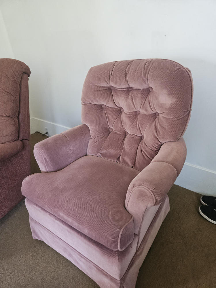 Selling two comfy pink swivel rocker armchairs. It's in good condition and would be a great addition to any living room or bedroom. The material is soft and the swivel function makes it extra relaxing!