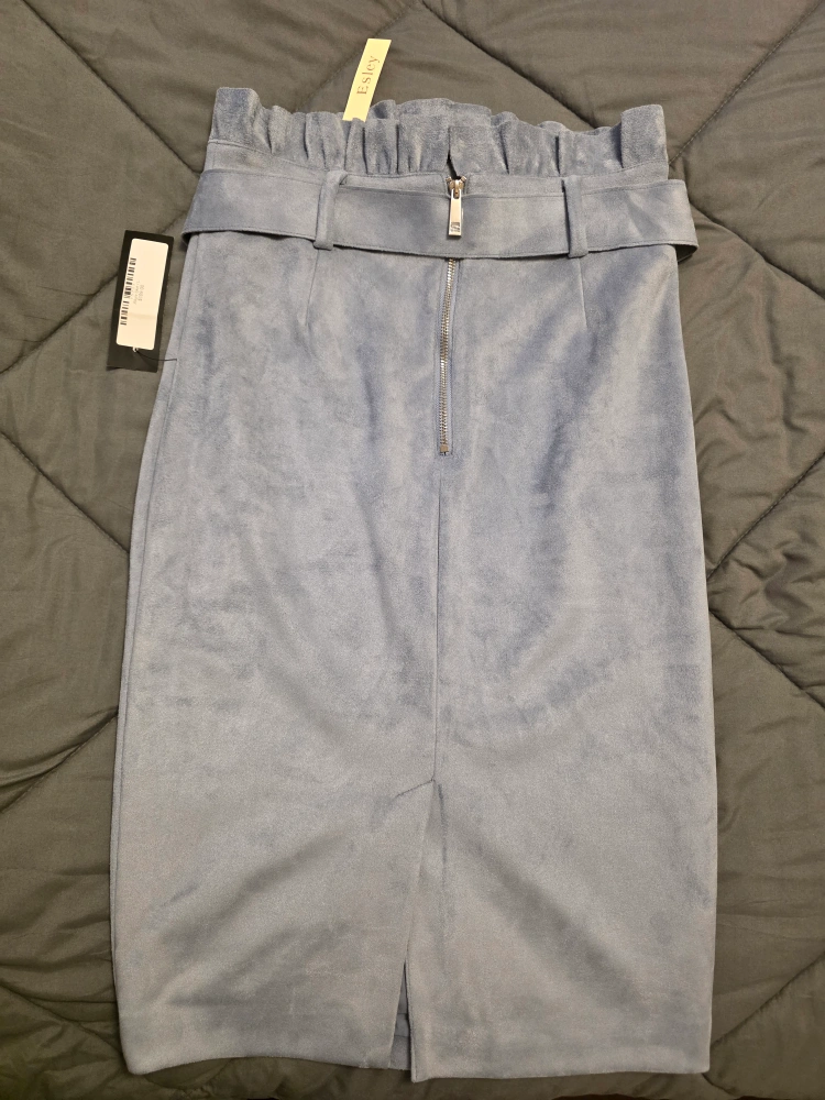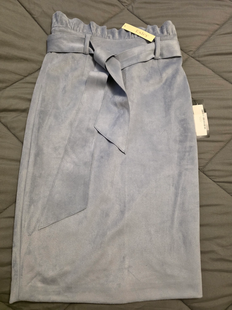This is a brand new Esley pencil skirt, still with the tags on! It's a lovely light blue colour and made of 100% polyester. The skirt is a size Large (26 inches length) and has a stylish belted waist. Perfect for dressing up or down!