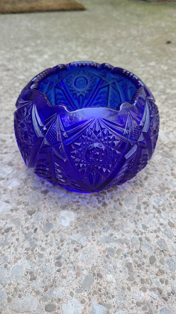 Beautiful vintage cobalt blue cut glass bowl with intricate starburst patterns. It's in great condition and would make a lovely addition to any home!