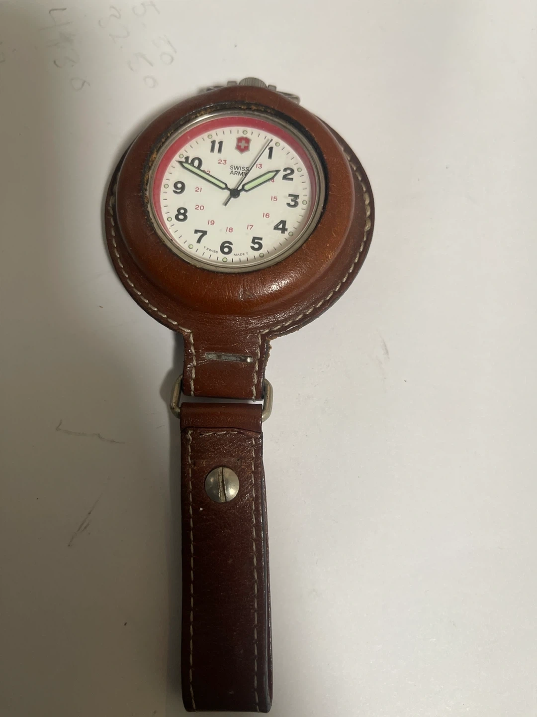 Selling a Swiss Army pocket watch! It comes with a brown leather case and strap. The watch face is white with easy-to-read numbers. Perfect for collectors or everyday use!
