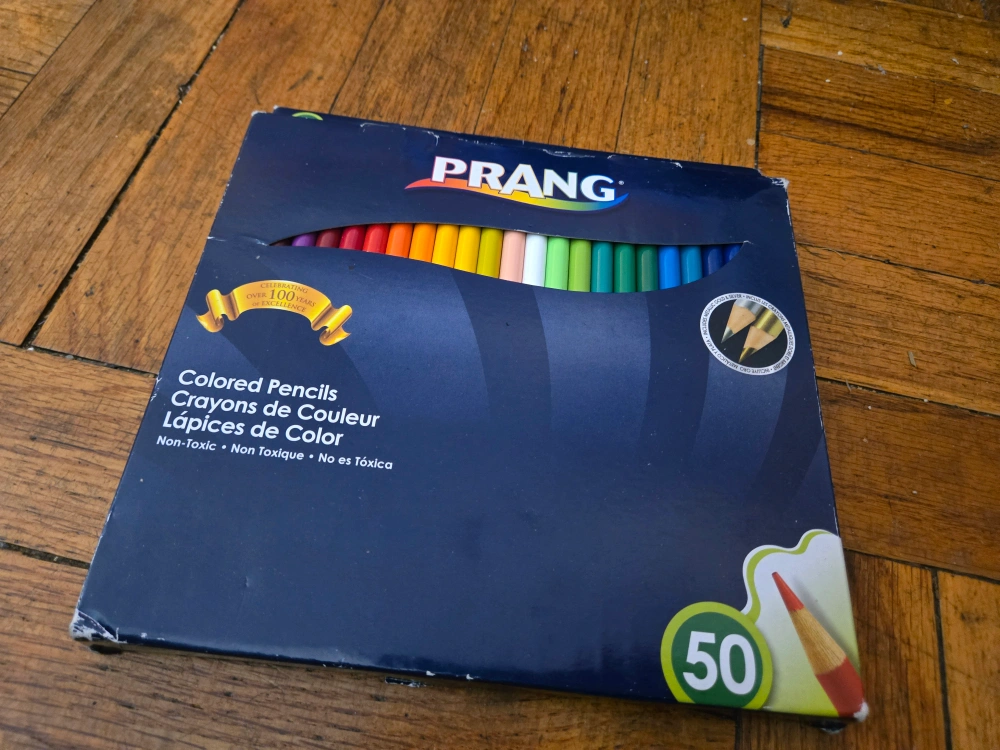 Selling a box of Prang colored pencils! This set includes 50 non-toxic pencils, perfect for all your coloring needs. The box is celebrating over 100 years of excellence! Available for meet up on Sunday only.