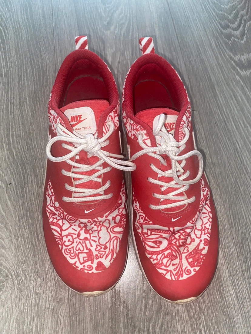 Selling a pair of Nike Air Max Thea sneakers in red. They have a fun doodle pattern on the front. Great for adding a pop of colour to your outfit!