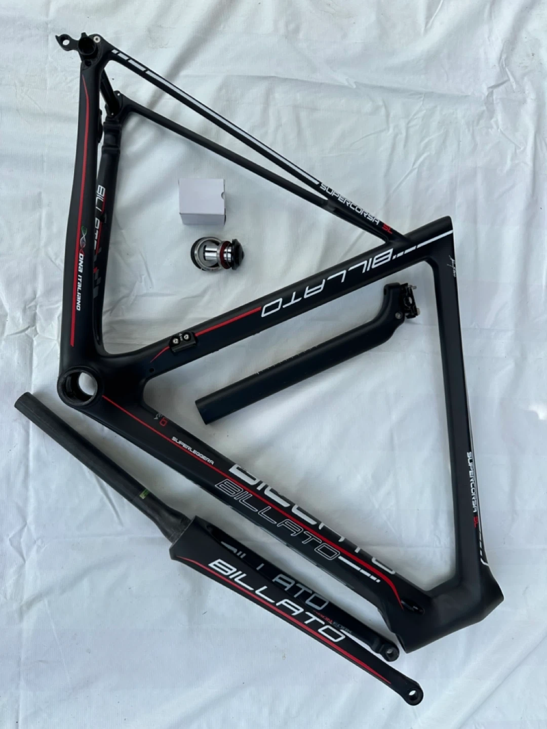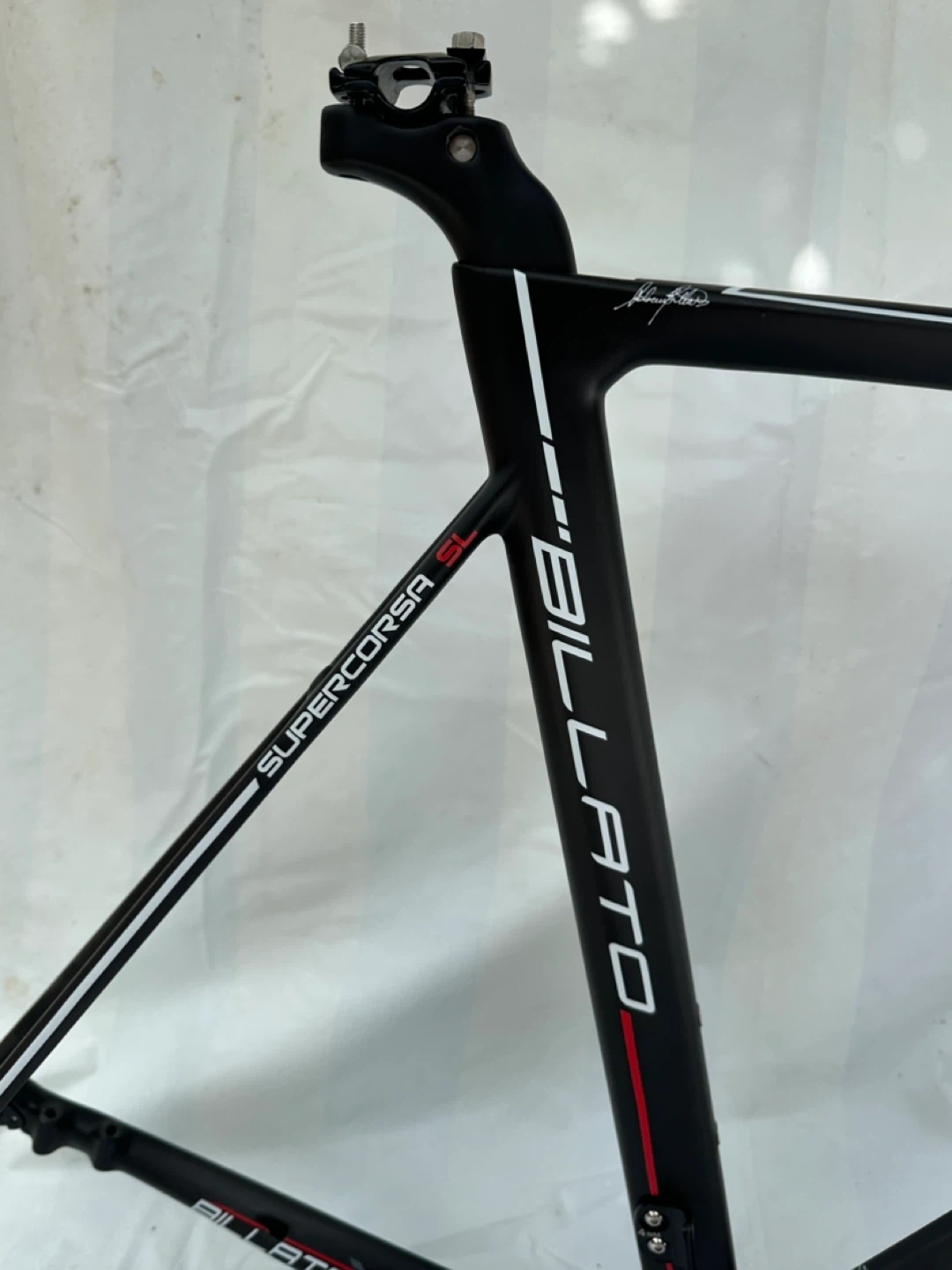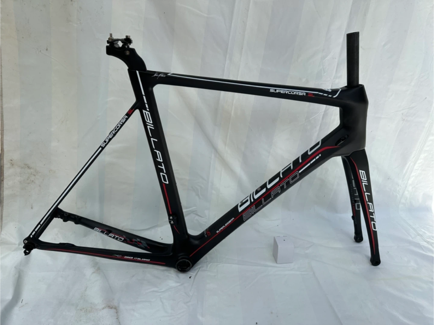 Selling a Billato Supercorsa bike frame. It's in great condition and ready for your next build! The frame features a sleek design with red and white accents. Supercorsa is the highest product in monocoque where I personally check all the production process with the best partner. From the carbon fiber to the moulding production, from the design to the lightest paints; these elements have contributed to the new generation of the monocoque Supercorsa Tech Specs Full carbon fiber frame highest modulus MRC MR60/HR40 monocoque system thru-axle dropout disc brake Frame weight 850 g Geiger is 59 cm UD external layer Internal cables routing for electronic devices and rear brake cable Electronic and mechanical devices compatible Seat tube custom shape with dedicated seat post Monocoque integrated fork disc brake thru-axle weight 385 g Tapered headtube 1”1/8 – 1”1/2 Integrated full carbon headset