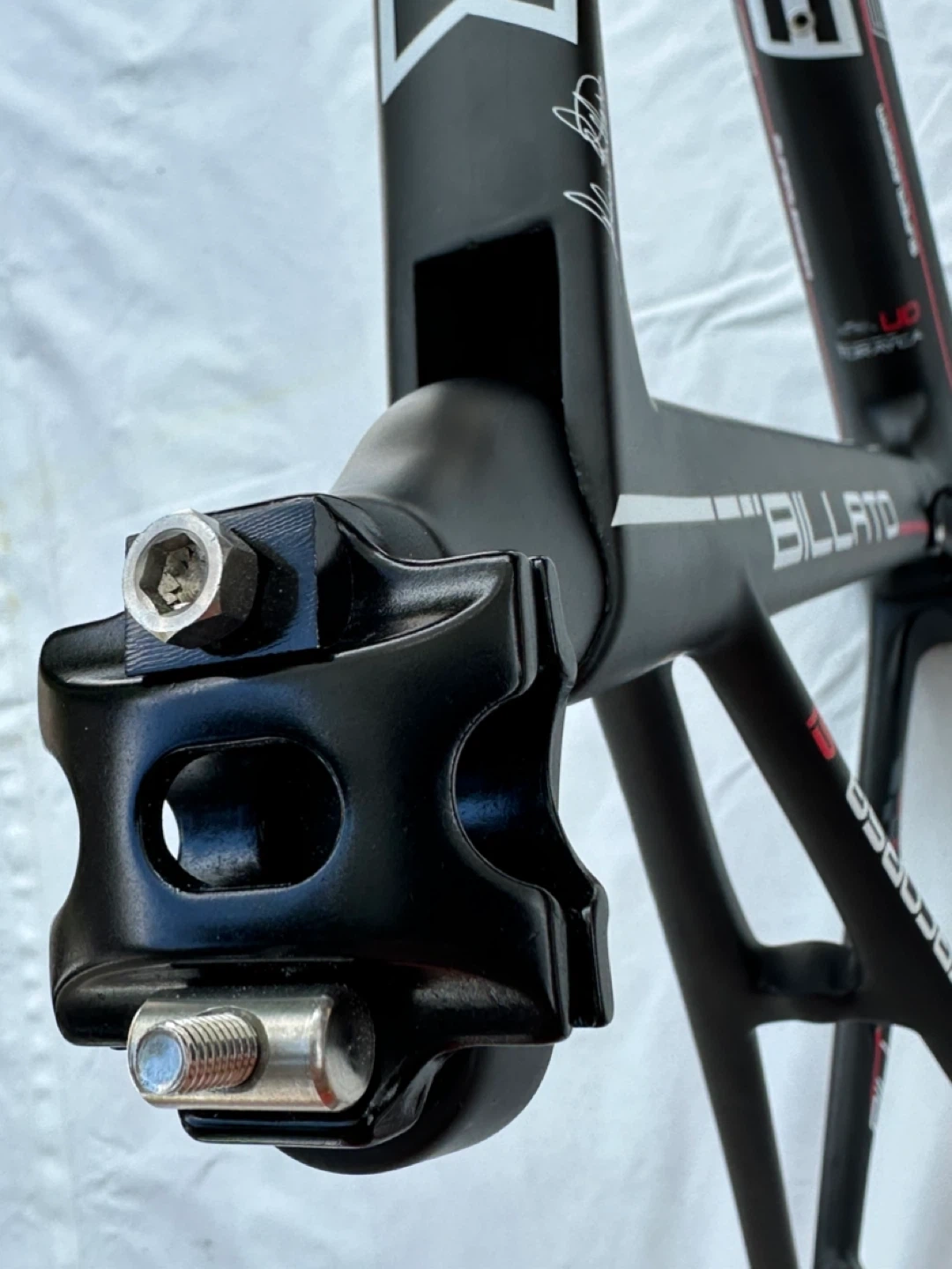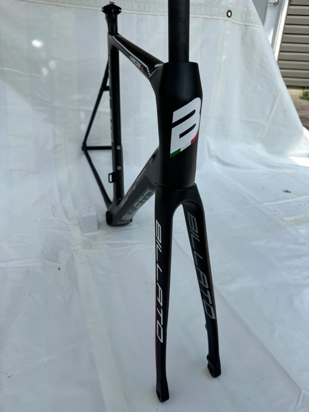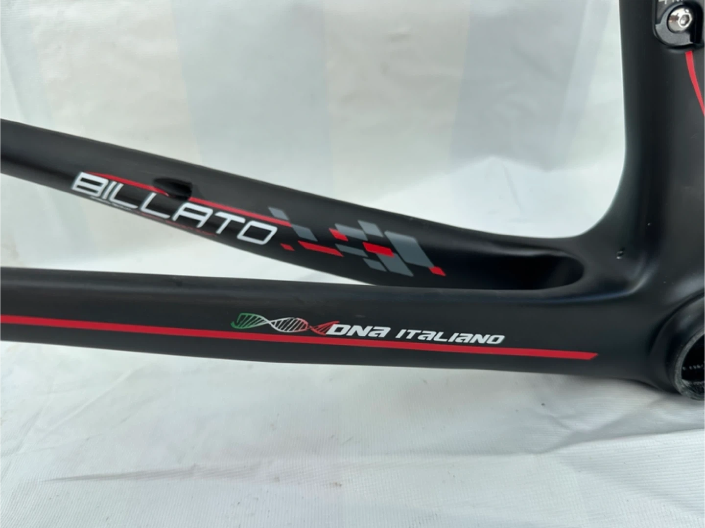 Selling a Billato Supercorsa bike frame. It's in great condition and ready for your next build! The frame features a sleek design with red and white accents. Supercorsa is the highest product in monocoque where I personally check all the production process with the best partner. From the carbon fiber to the moulding production, from the design to the lightest paints; these elements have contributed to the new generation of the monocoque Supercorsa Tech Specs Full carbon fiber frame highest modulus MRC MR60/HR40 monocoque system thru-axle dropout disc brake Frame weight 850 g Geiger is 59 cm UD external layer Internal cables routing for electronic devices and rear brake cable Electronic and mechanical devices compatible Seat tube custom shape with dedicated seat post Monocoque integrated fork disc brake thru-axle weight 385 g Tapered headtube 1”1/8 – 1”1/2 Integrated full carbon headset