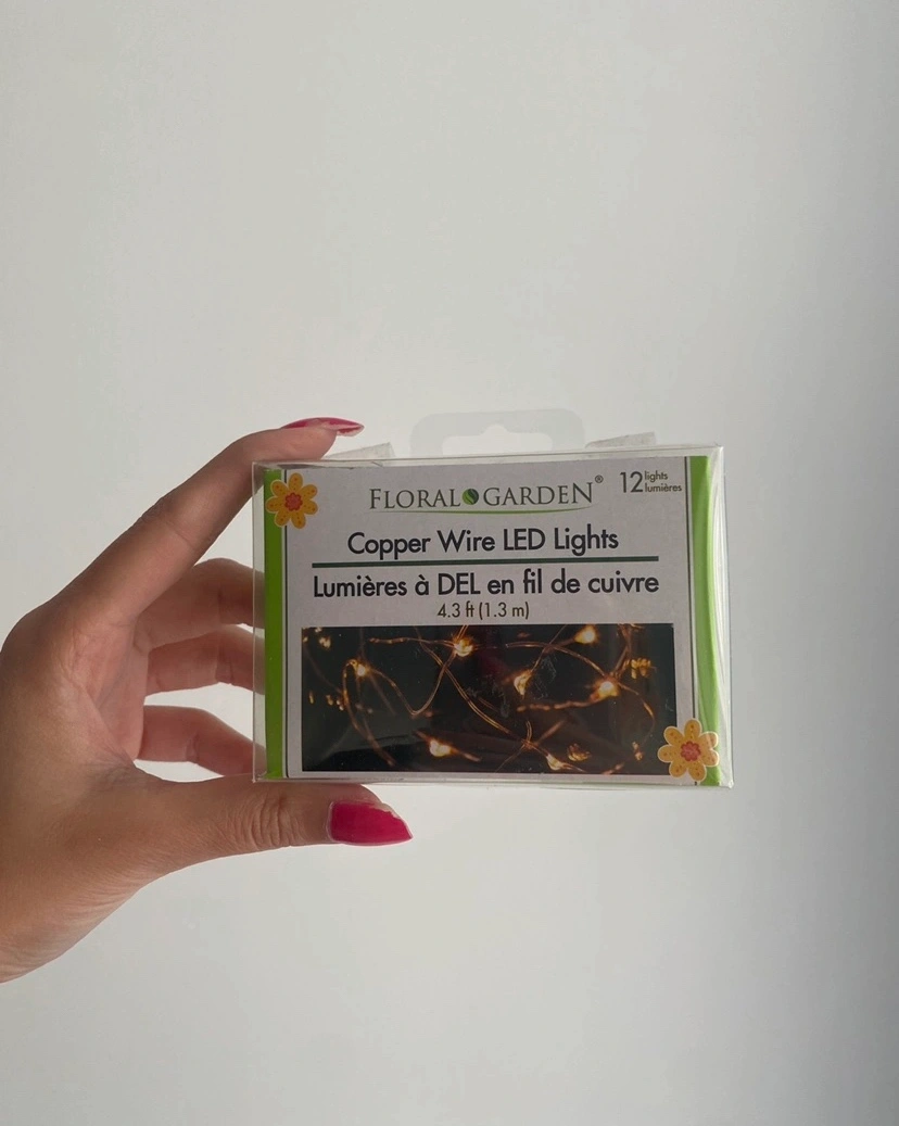 I have a brand new package of Floral Garden copper wire LED lights. It's 4.3 ft (1.3 m) long and includes 12 lights. Perfect for adding a little sparkle to any space!