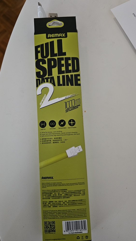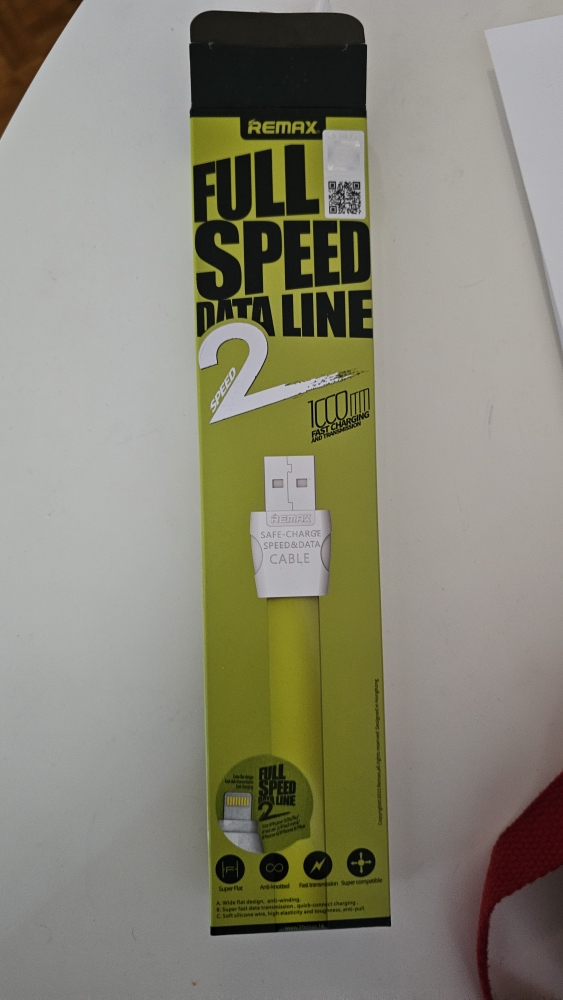 We bought but never needed or used so time to go : a Remax Full Speed Data Line cable! It supports 1000 mA fast charging and super compatibility. The cable features a wide flat design, anti-winding, and fast transmission