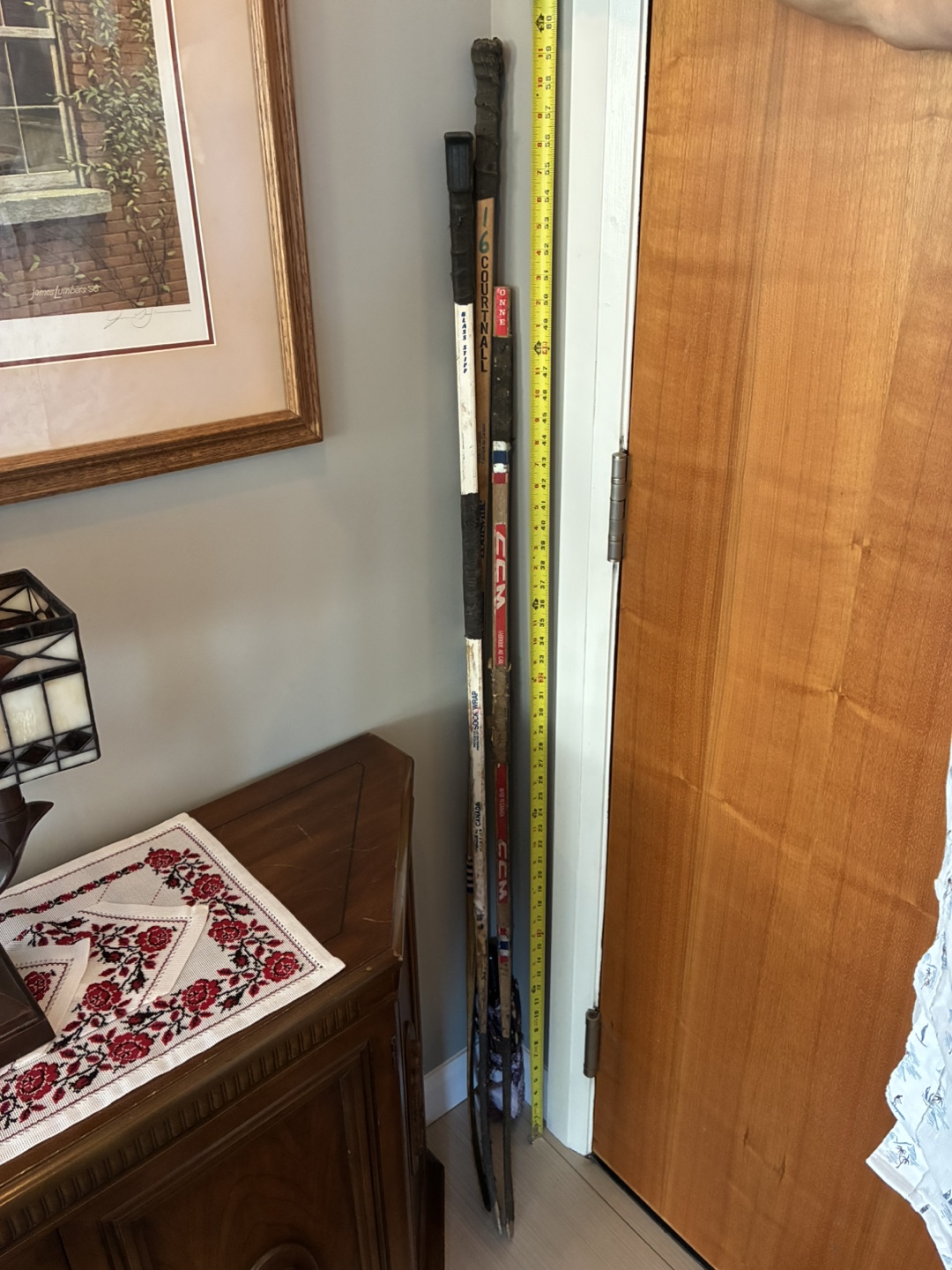 Giving away a few used wooden hockey sticks. Brands include CCM, Victoriaville and Louisville. The sticks are of varying lengths. They show signs of wear and tear.