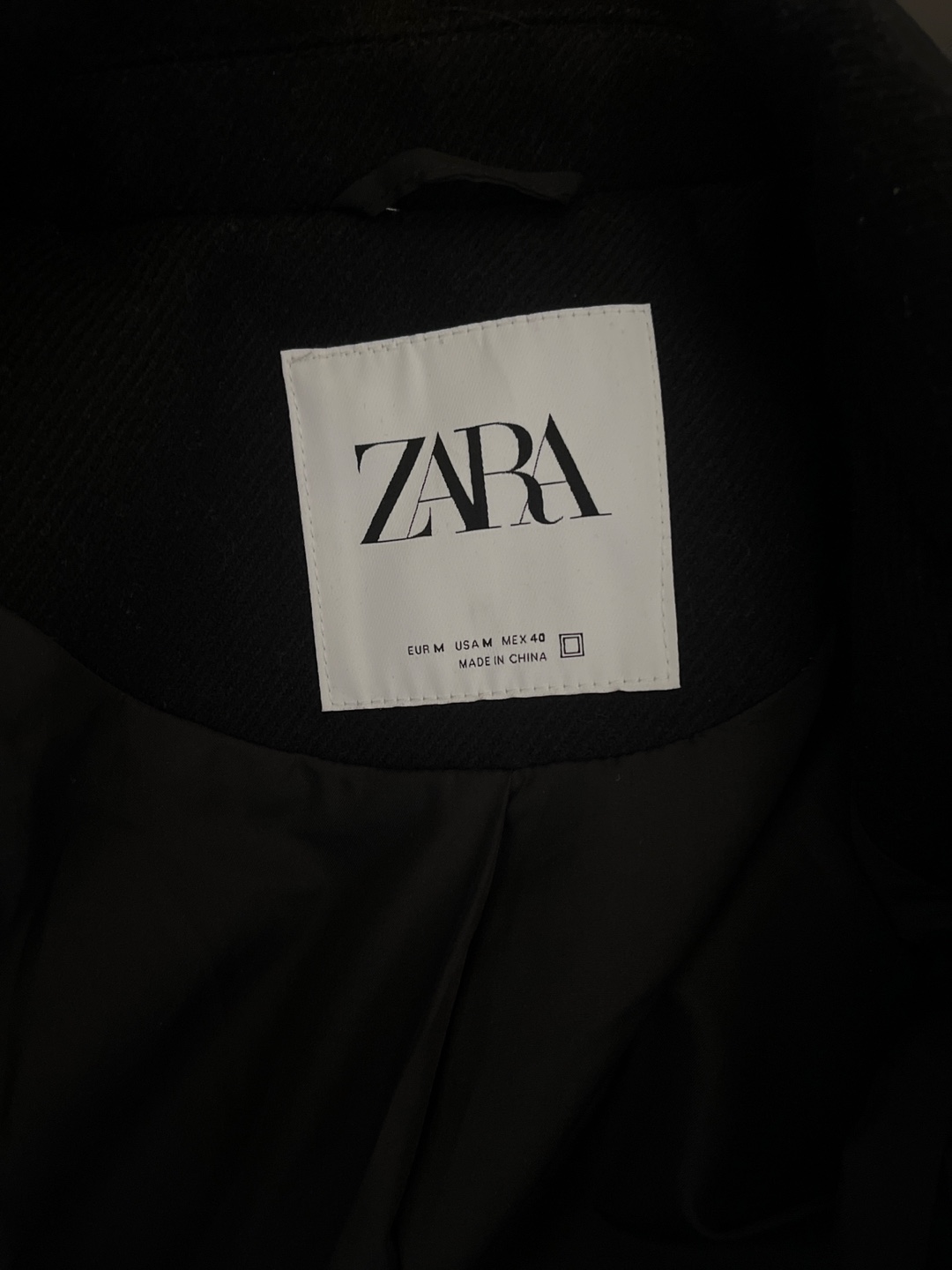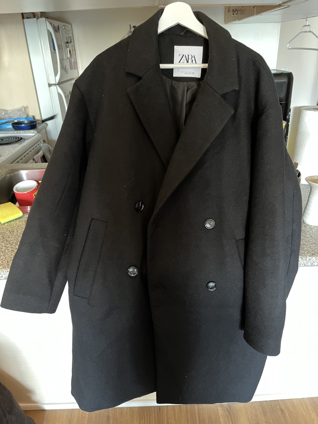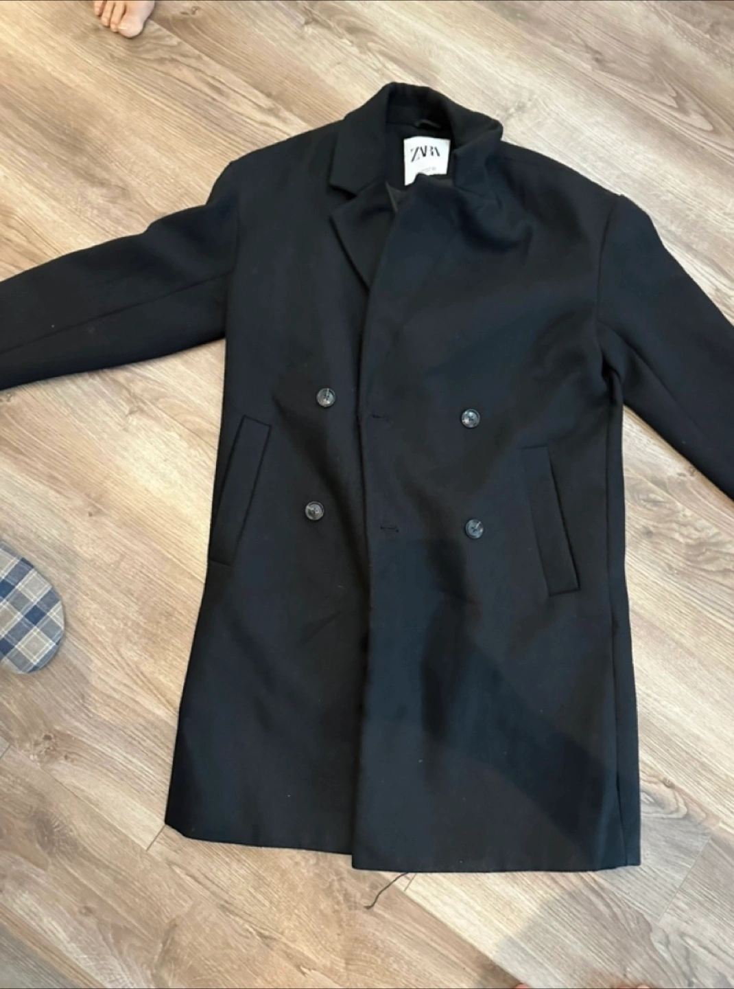 Selling a stylish Zara coat in great condition! It's a classic black colour with a double-breasted design. Made from a wool blend, it's perfect for keeping warm during the cooler months.
