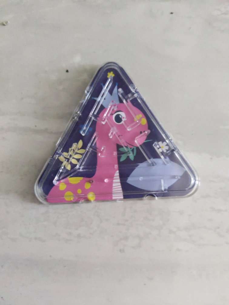 Here's a fun triangle maze puzzle toy featuring a pink dinosaur design! It's a compact and engaging activity for kids