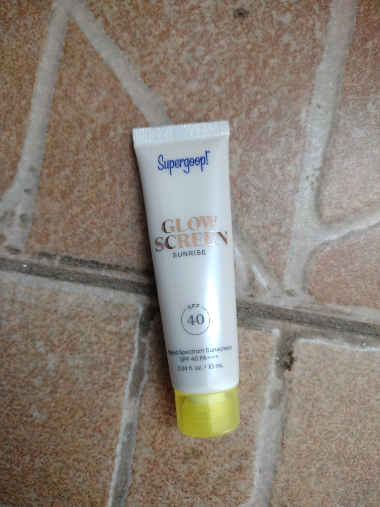 Supergoop! Glowscreen in Sunrise, with SPF 40! It's a broad spectrum sunscreen that's dermatologist-tested, non-irritating, and vegan. It has no synthetic fragrance and is a lightweight, pearlescent formula. It can be used as a highlighter or a luminous primer. Size is 0.34 fl oz / 10 mL