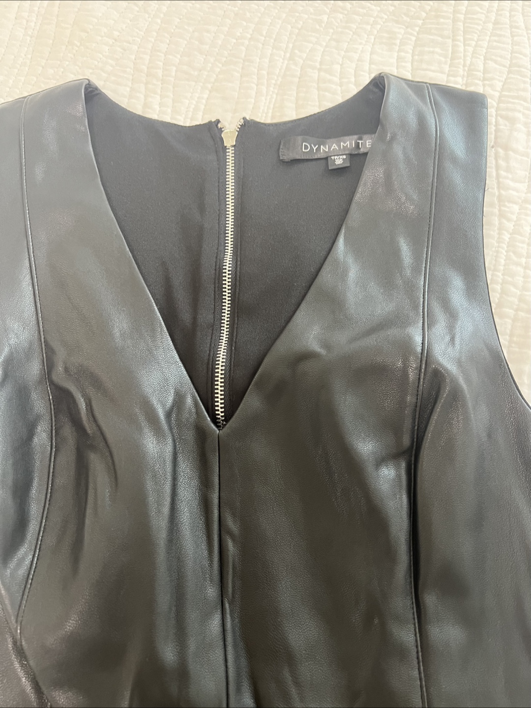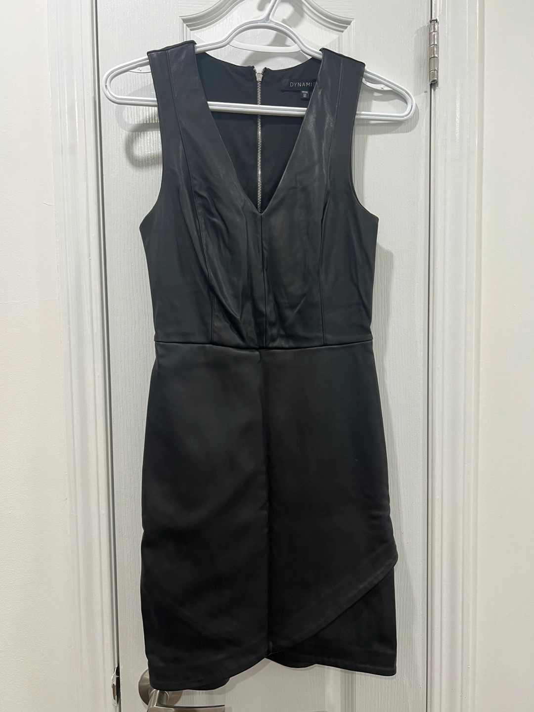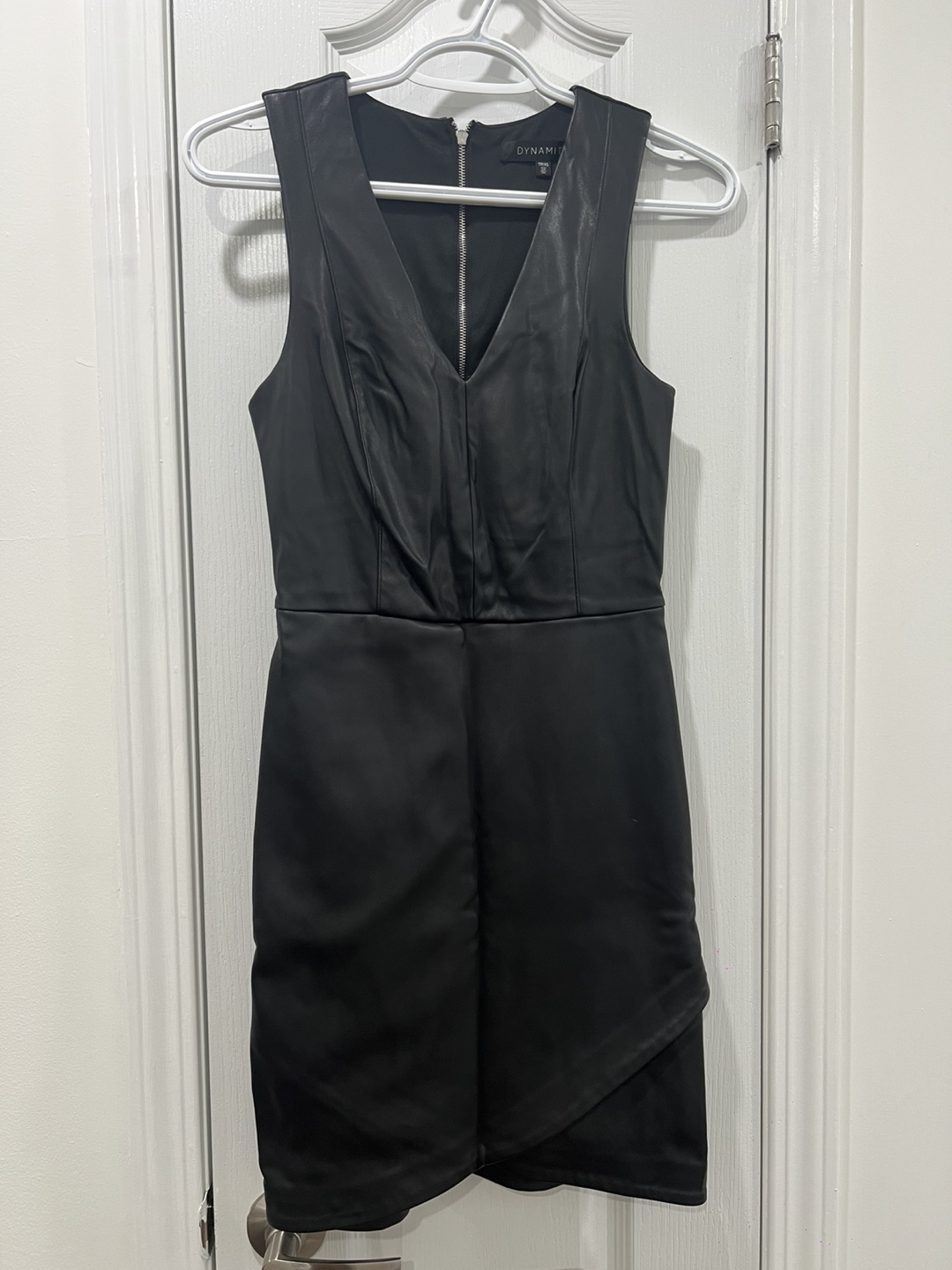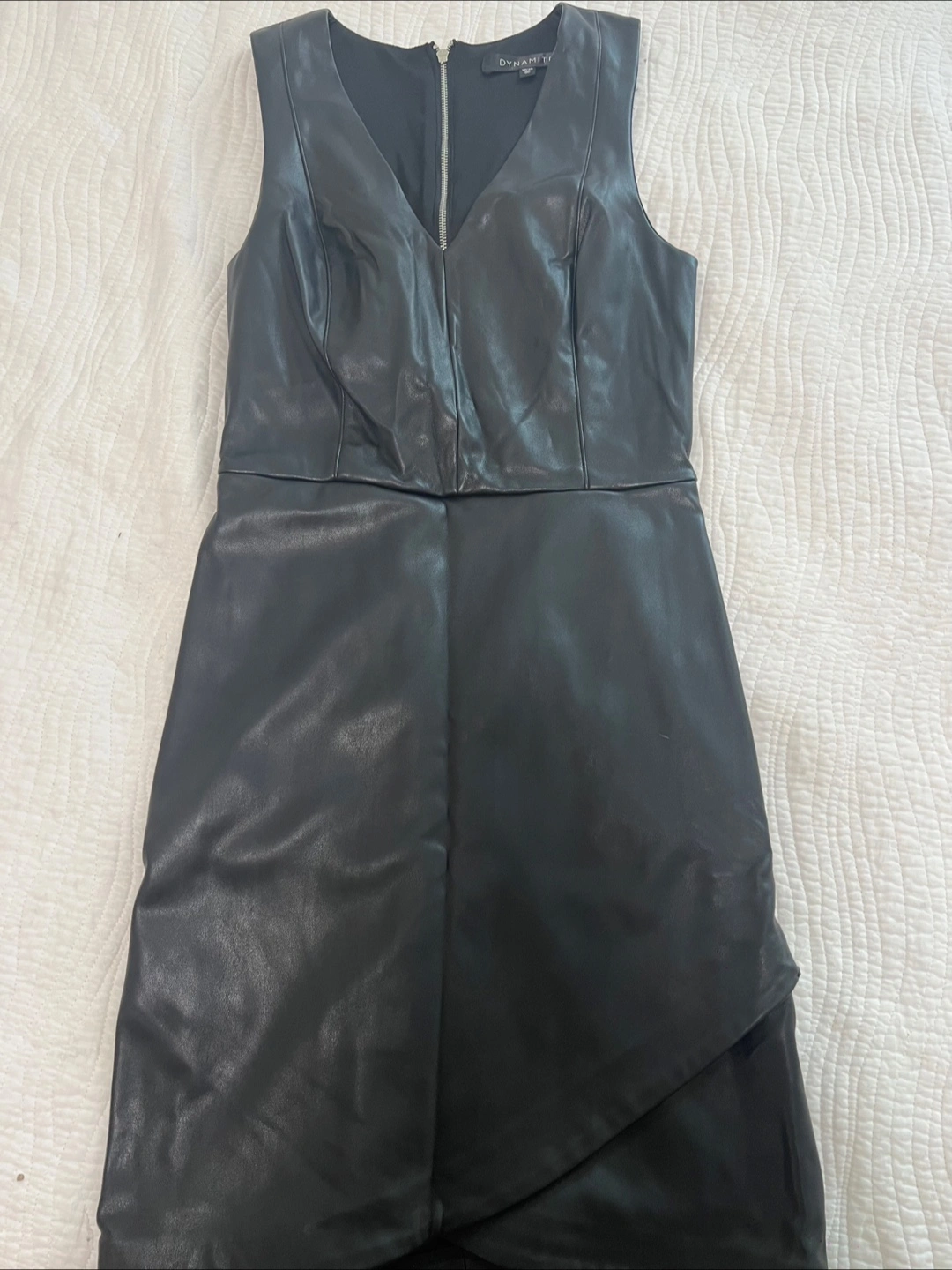 Selling a stylish black faux leather dress from Dynamite! It's a size small and features a flattering V-neck and a unique asymmetrical hem. Perfect for a night out or a special occasion!