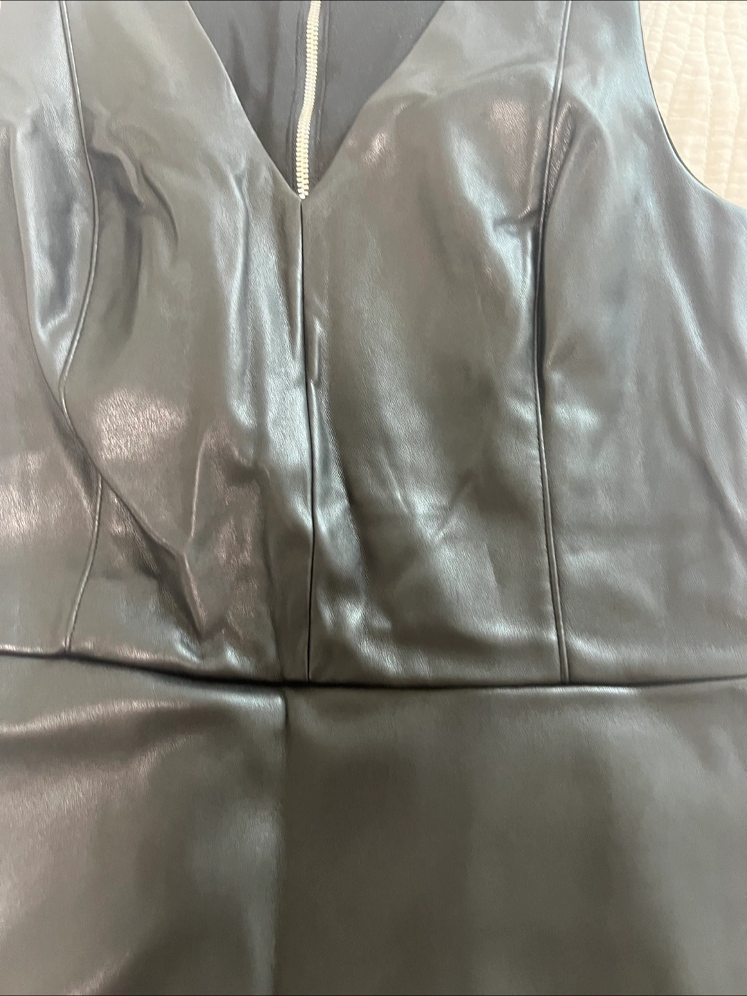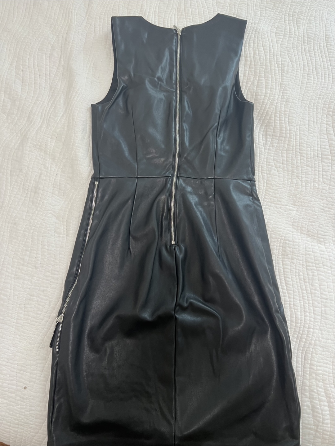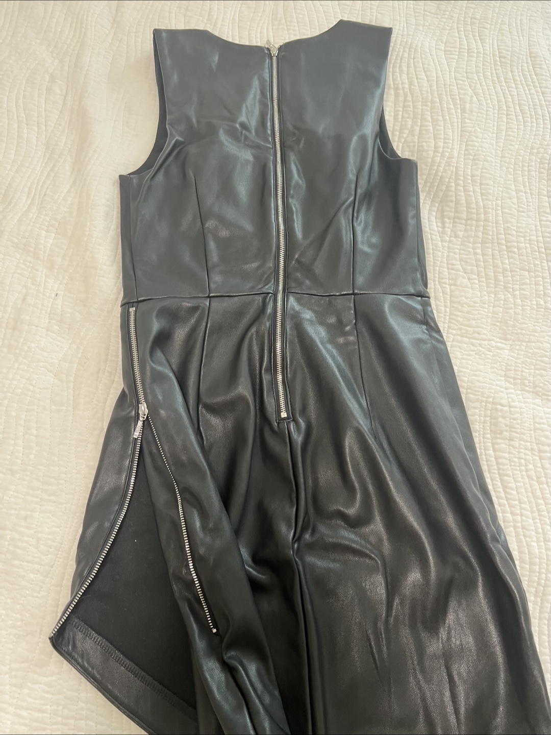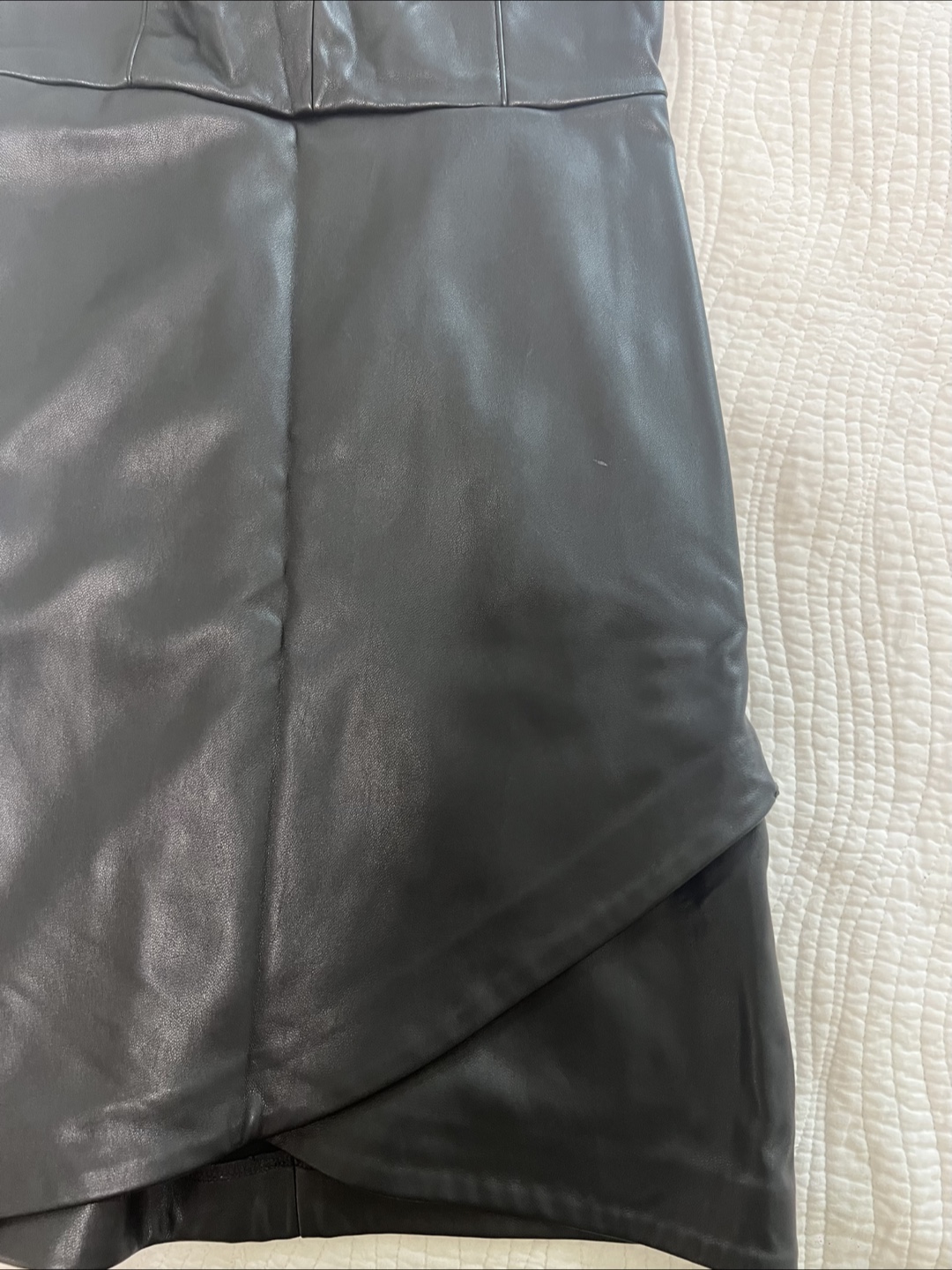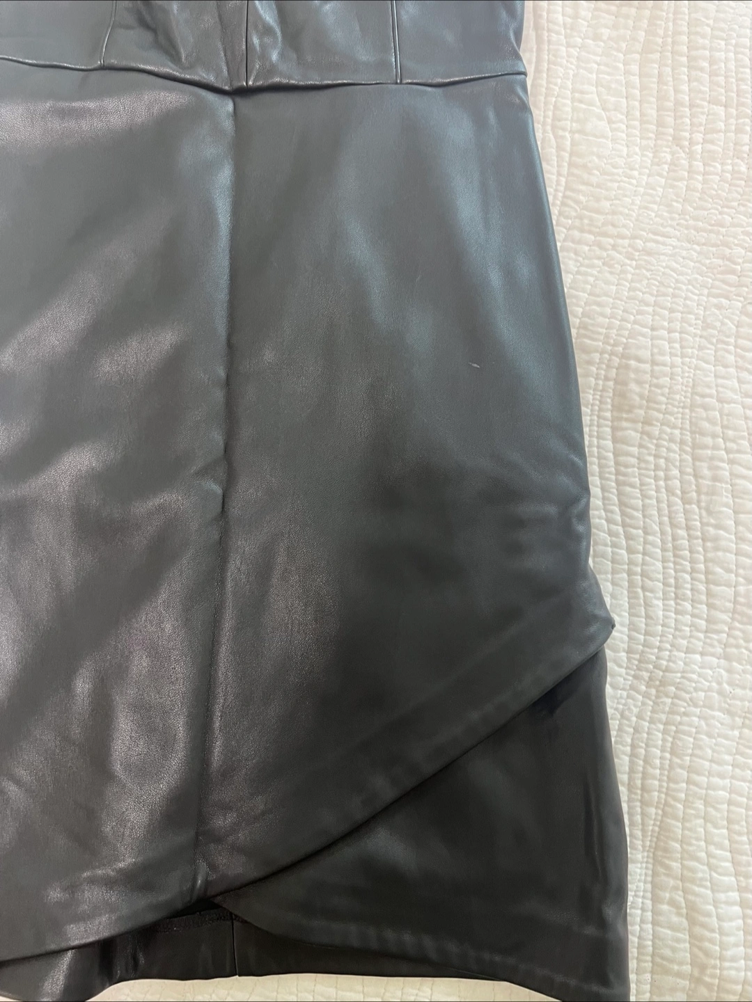 Selling a stylish black faux leather dress from Dynamite! It's a size small and features a flattering V-neck and a unique asymmetrical hem. Perfect for a night out or a special occasion!
