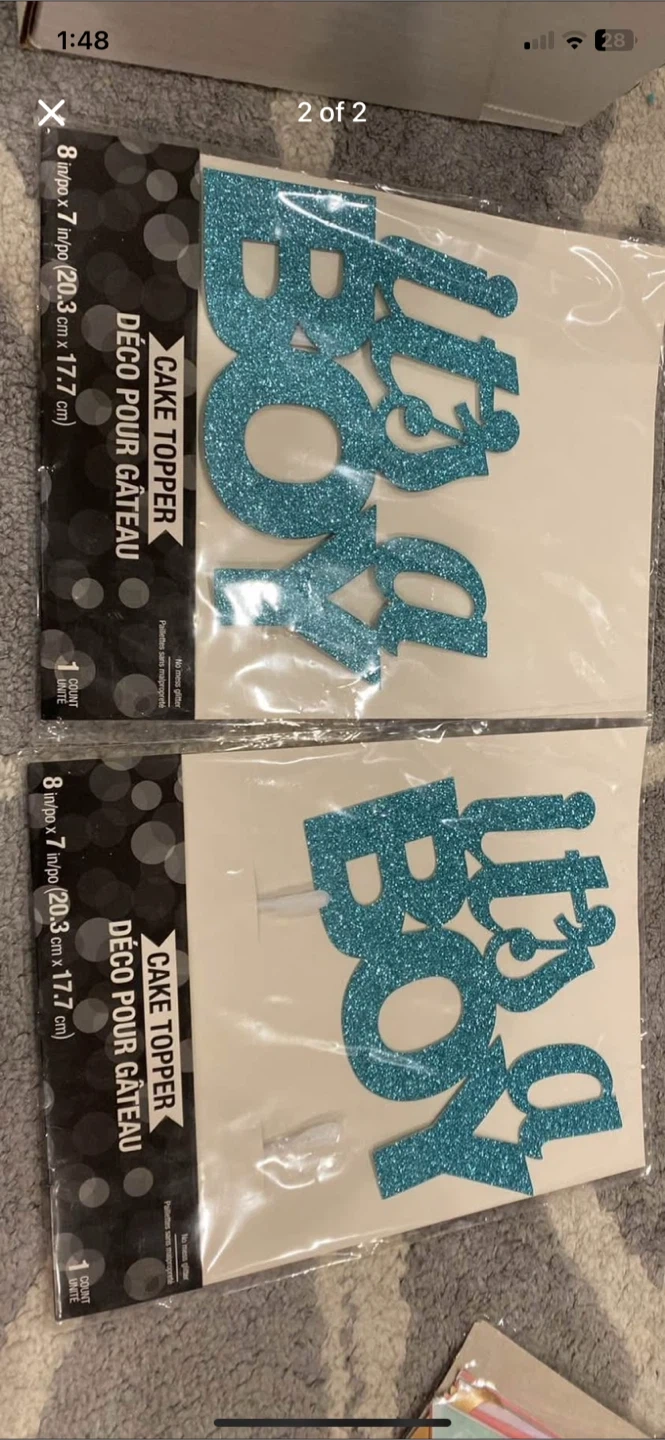 I have two "It's a Boy" cake toppers, still new in their packaging! They're a sparkly blue colour and measure 8 in x 7 in (20.3 cm x 17.7 cm). Perfect for a baby shower or a little one's birthday cake